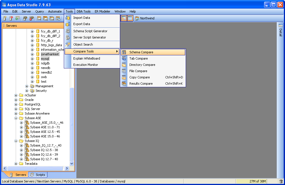 There are two different types of Compare for Database Schemas; Schema Compare for schema objects and Compare for schema DDL. Schema Compare (schema objects) can be done with a multi select of two databases in the Schema Browser, or with the menu Tools->Compare Tools->Schema Compare. With the Schema Compare Tool it is possible to compare individual objects, including databases, tables, triggers, indexes and more within different databases. A full discussion of the Schema Compare Tool is found on the Schema Compare Tool page. Once a Schema Comparison has been performed, it is also possible to compare database data. See the Compare Schema Data section of the Schema Compare page for more. Compare (DDL compare) of two database schema objects can be done with a right click on the two schema objects in the Schema Browser and selecting Compare from the popup menu. Aqua Data Studio generates the DDL comparison as a Query Results Comparison, placing the DDL of each selected schema object side by side with splines and adjacent line numbering. Just like the other compare tools, each difference is color highlighted to indicate Deleted, Changed and Added. Character-level differences are marked with text bolding. Along the right side of the comparison results the Annotation Bar bookmarks changes with colored lines for quick navigation. See the page on the Query Results Compare Tool for a complete description.