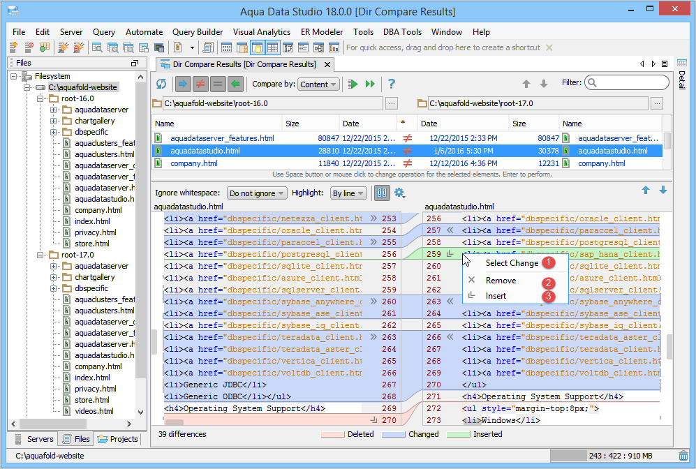 . The contents of the selected file are shown in the lower pane, also known as the Differences pane with the differences highlighted. This pane is further split into a split-pane where each file takes up half of the pane and shows connecting splines for identifying where the deletions, changes and additions occur. Comparisons show the character differences in a modified line with bolding and background color highlights indicate modified blocks. If they are not identical they are highlighted by default in pink (deleted), purple (changed) or green (added). These colors can be changed from the Options dialog. You can also use this tool to synchronize the contents of the directories