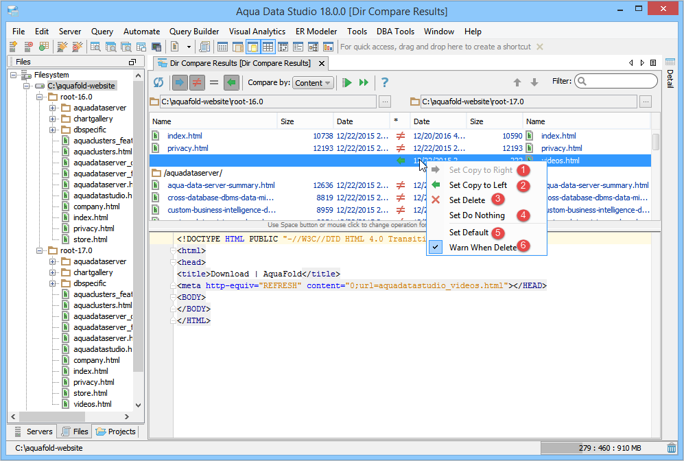 | Set Copy to Right | Copy the item from the left side to the right side. This option is disabled if the file is present only in the right side. |