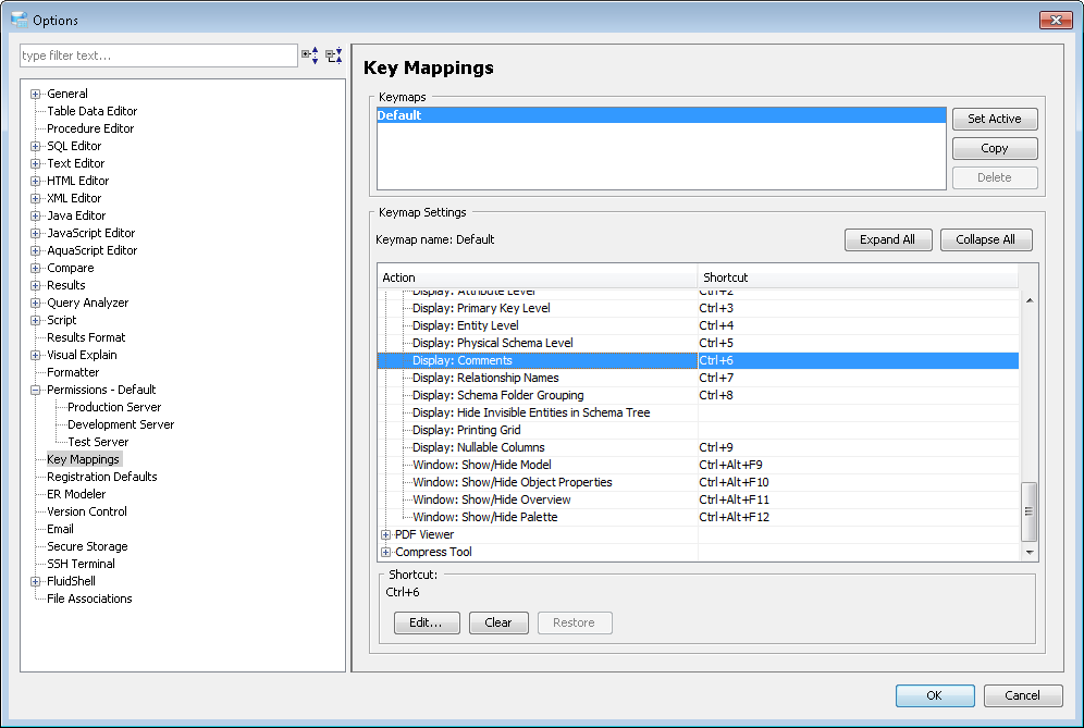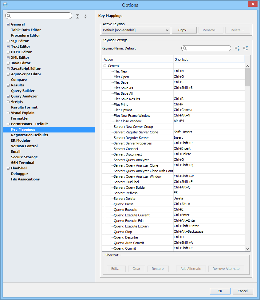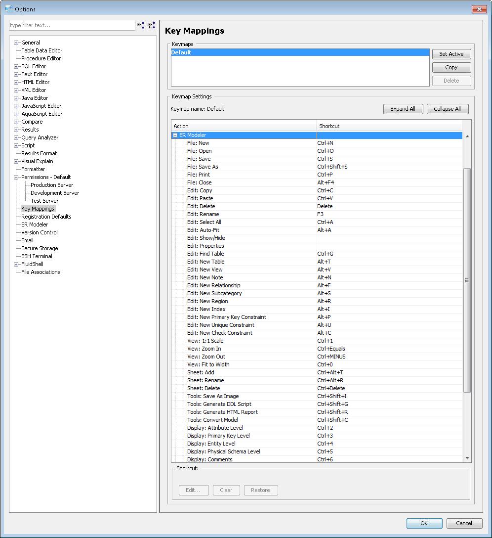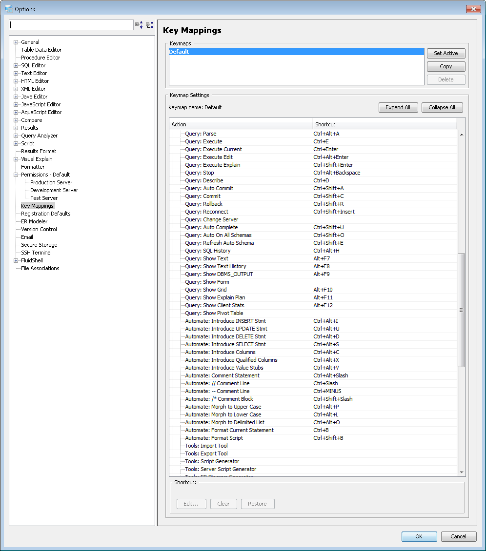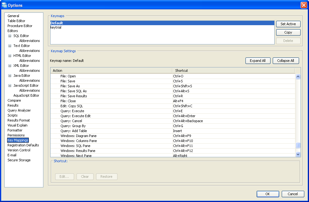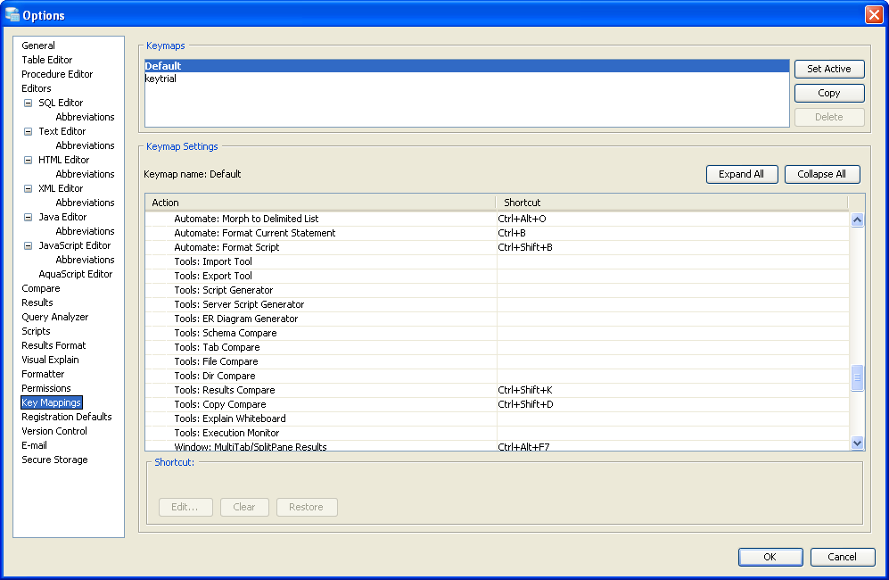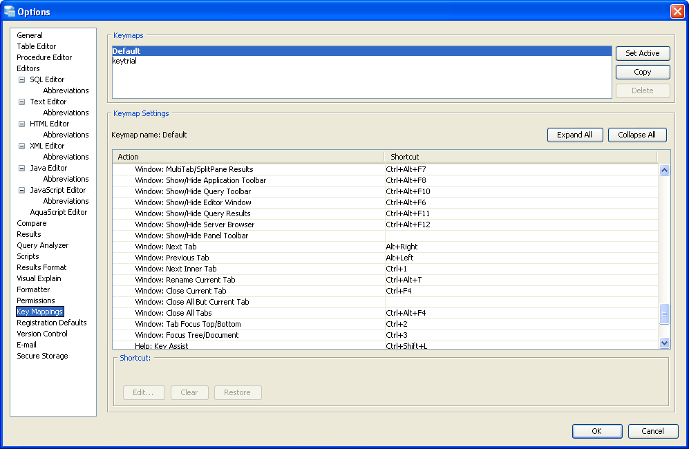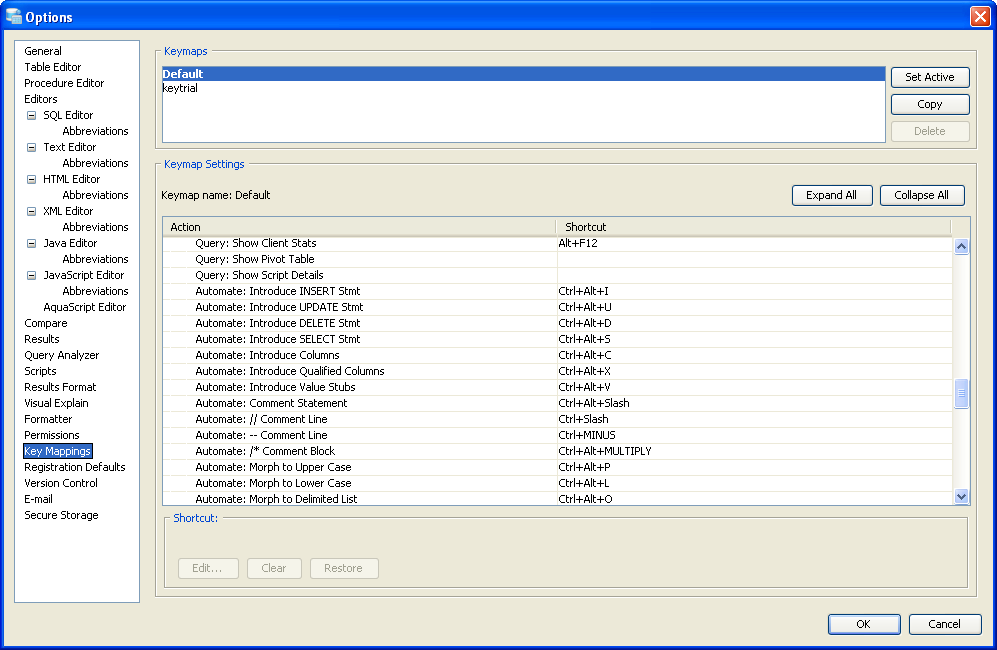 Key Mapping Options Key Mappings - The Key Mapping Options allows you to configure new key mapping profiles with new key bindings. This allows you to configure any keystroke to any action. The Key Mapping Options allow creating custom keymaps by copying existing keymaps, then configuring individual shortcut key bindings within a custom keymap. All custom keymaps may be edited, renamed and deleted. It is possible to add alternate keybinding shortcuts within a custom keymap for the same action. There are two built-in keymaps which cannot be renamed, edited or deleted, but may be copied as the foundation for new custom keymaps: