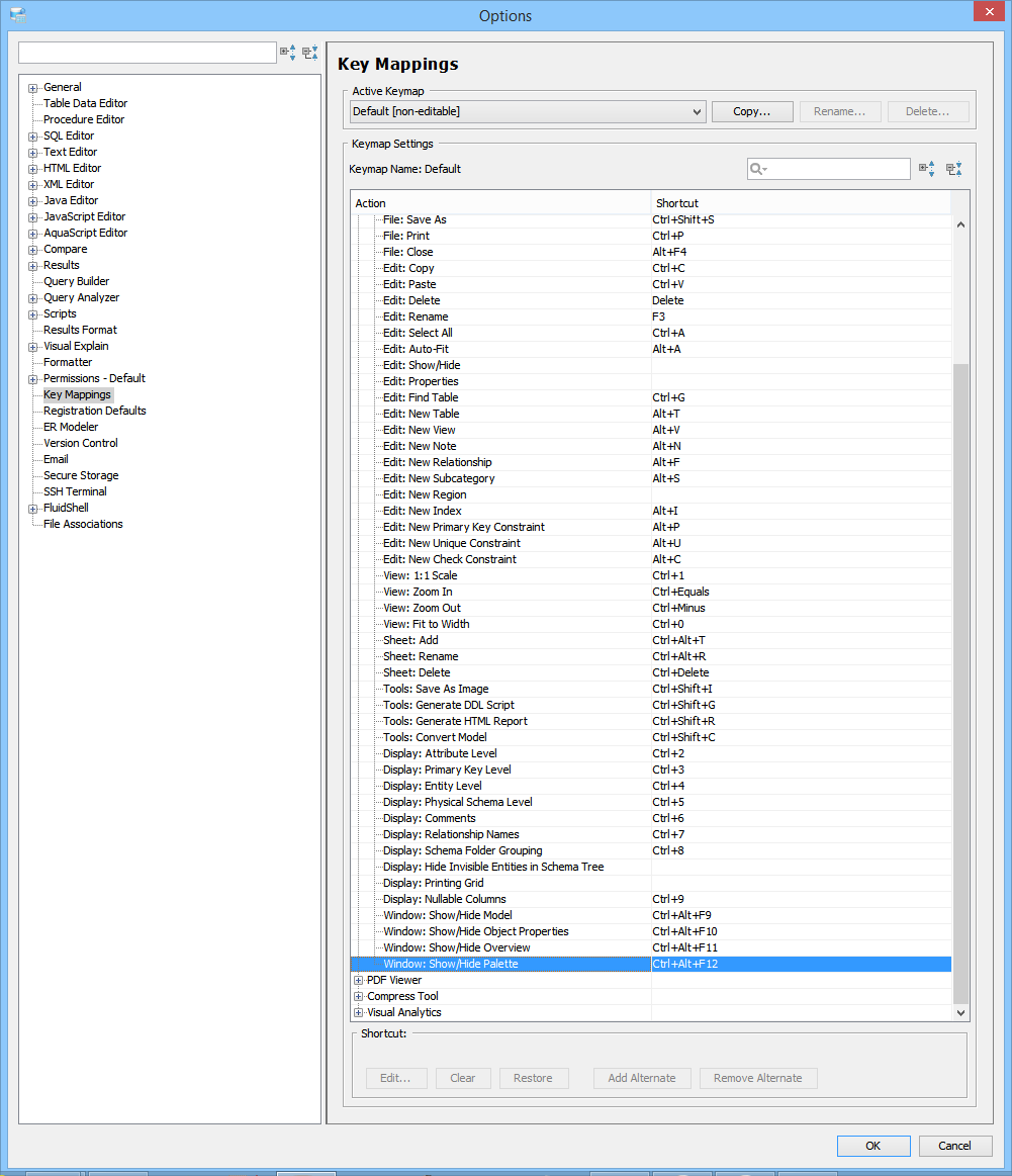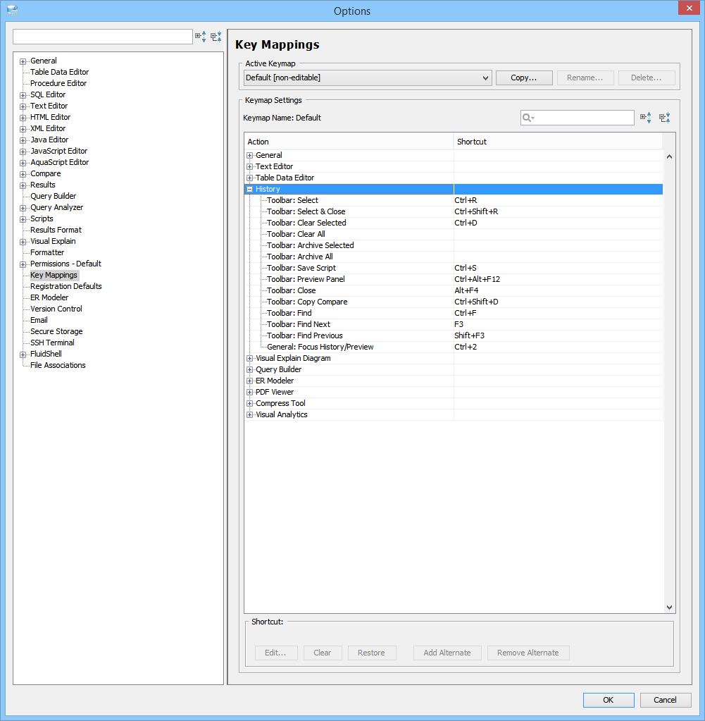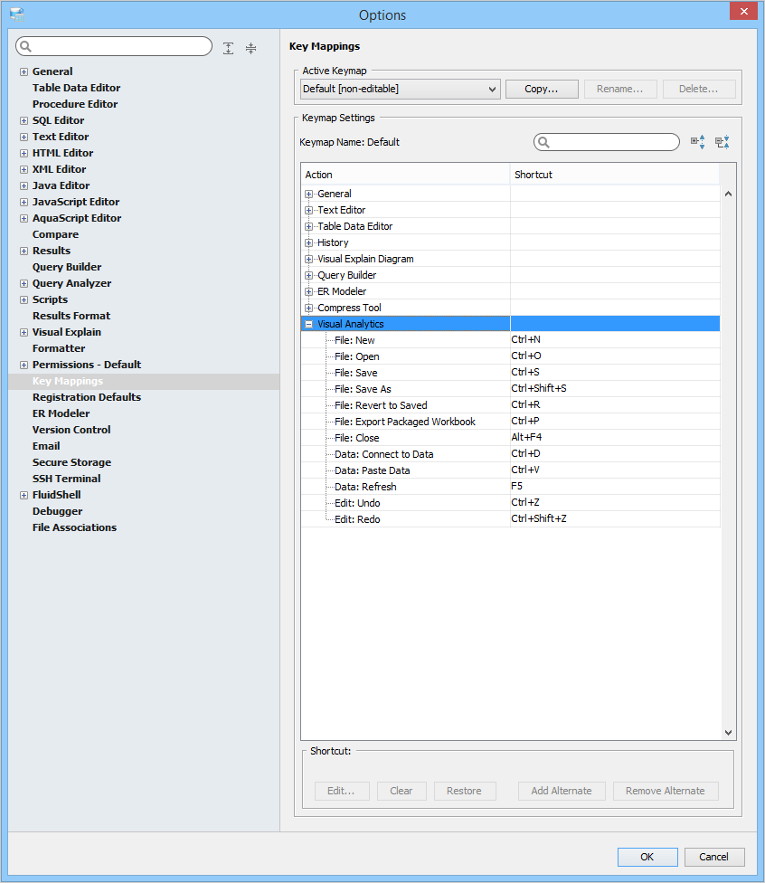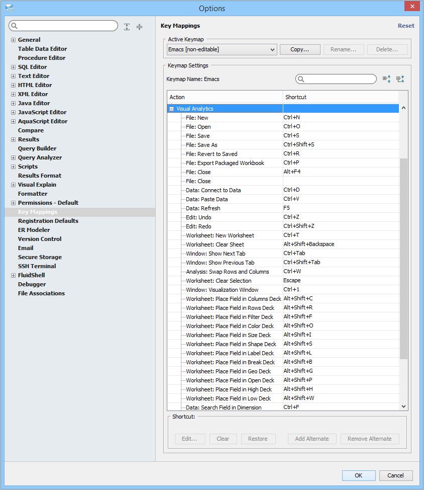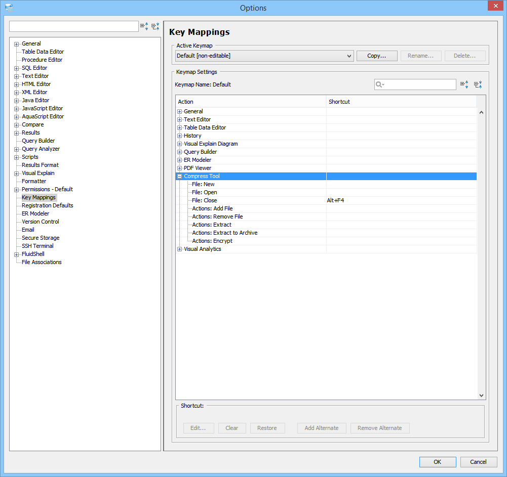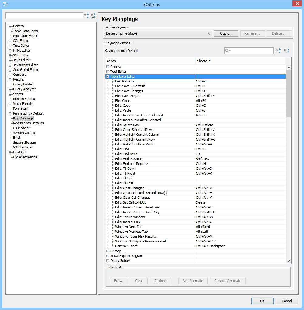 Key Mapping Options Key Mappings - The Key Mapping Options allows you to configure new key mapping profiles with new key bindings. This allows you to configure any keystroke to any action. The Key Mapping Options allow creating custom keymaps by copying existing keymaps, then configuring individual shortcut key bindings within a custom keymap. All custom keymaps may be edited, renamed and deleted. It is possible to add alternate keybinding shortcuts within a custom keymap for the same action. There are two built-in keymaps which cannot be renamed, edited or deleted, but may be copied as the foundation for new custom keymaps: