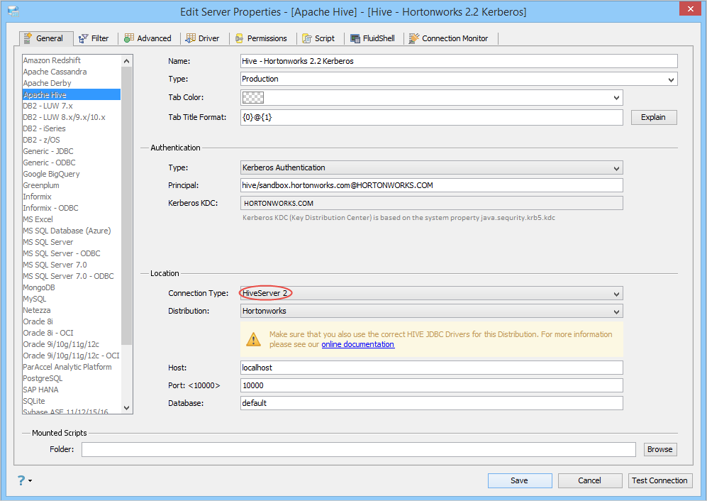 An example using a Hortonworks distribution connecting to Hive server 2 with Kerberos authentication