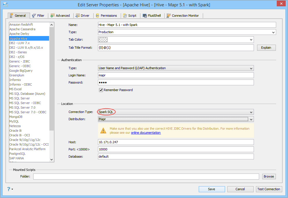 If you need to connect to Mapr, Hortonworks or Cloudera distributions of Hive, you must remove the Apache Hive JDBC Drivers that come preinstalled in <ADS_INSTALL>/lib/drivers. Replace them with drivers from your distribution before you choose a new distribution type in the Distribution drop-down within the General Tab. Follow the steps to connect to Hortonworks, Cloudera or MapR Distributions of Hive on the Apache Hive JDBC Drivers page.