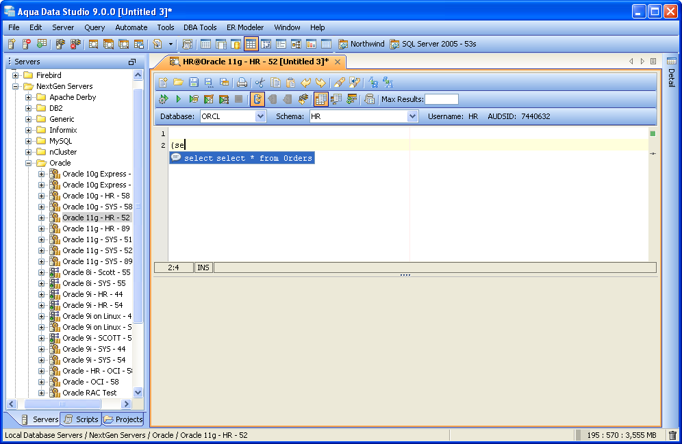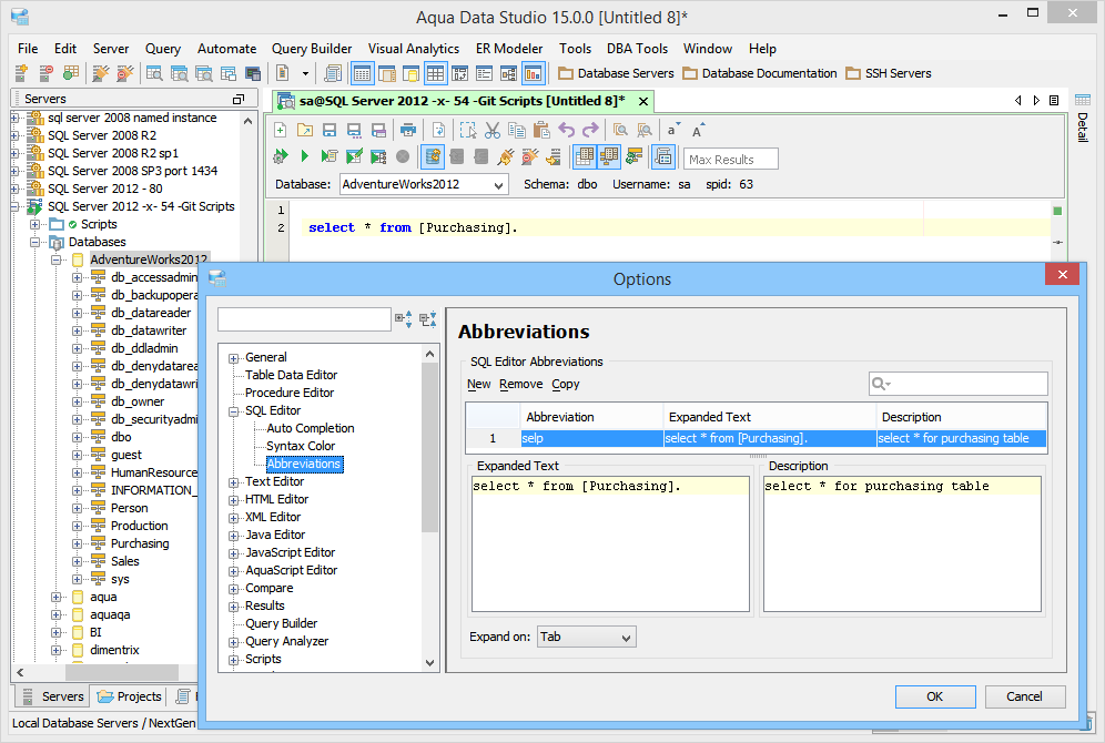 While writing SQL statements the user must be aware of separating statements with the appropriate statement separator (use only "GO" or "/") so that the editor may appropriately analyze the current statement. Having multiple statements not separated by statement separators will prevent auto-completion from providing the correct tables and columns. Abbreviation Autocompletion - Autocompletion also works with abbreviations that a user has created for each of the editors (File->Options->Editors->SQL Editor->Abbreviation). If the text that begins an abbreviation is typed, Aqua Data Studio will prompt the user with a popup containing the contents of the abbreviation. Clicking on this prompt with the mouse will complete it, as will typing the abbreviations trigger key stroke. Large blocks of text can be set from an abbreviation, creating a customized autocompletion prompt.