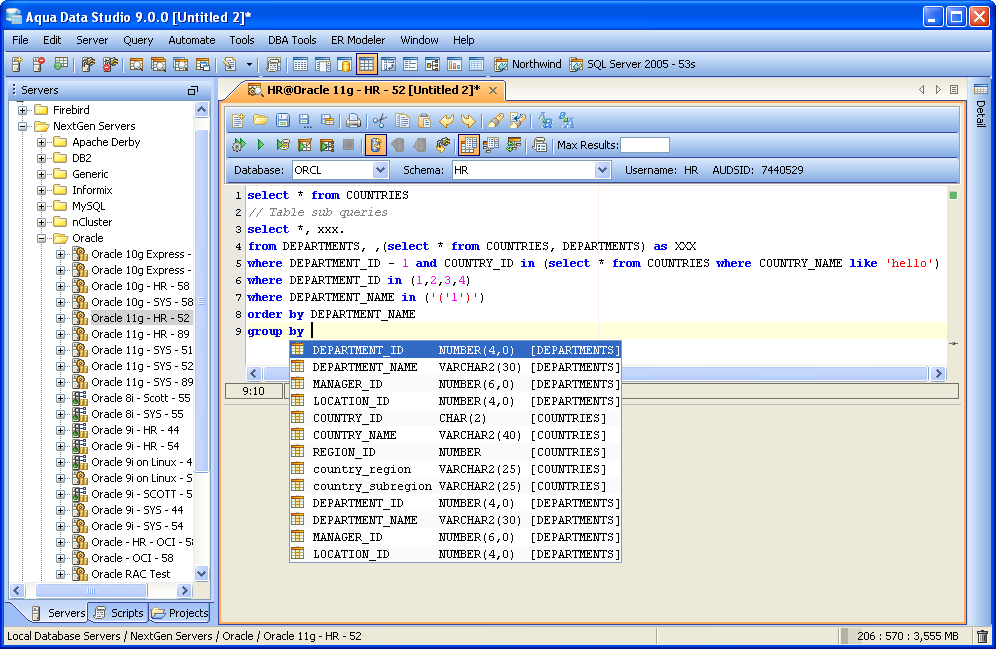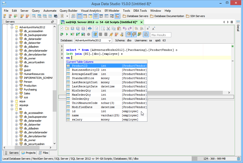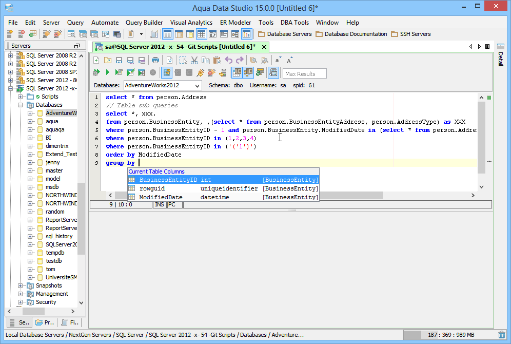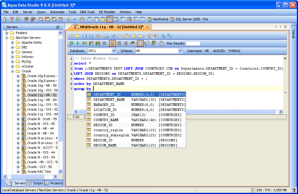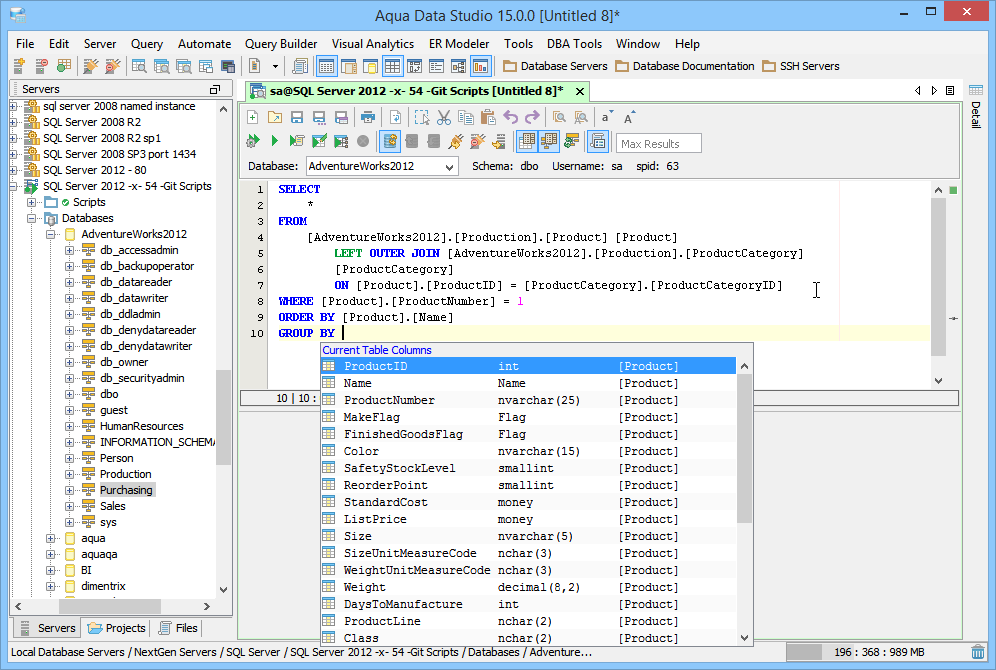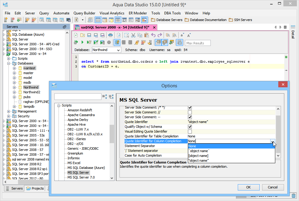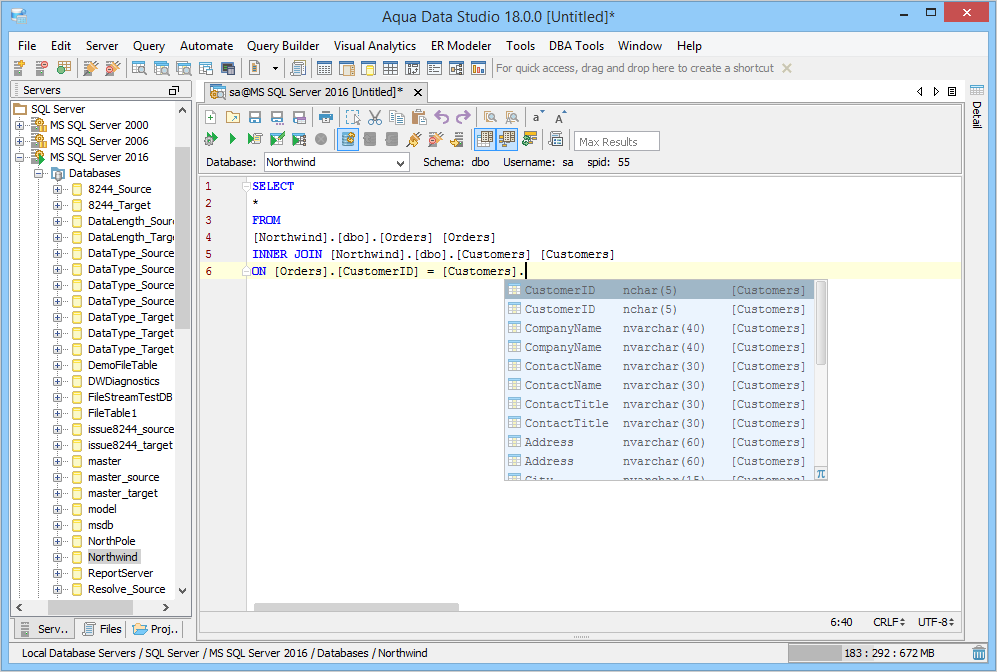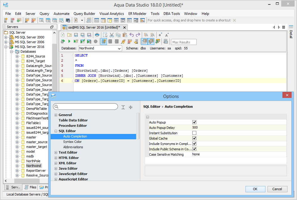 Aqua Data Studio supports auto-completion for database tables and columns. As the user types SQL statements the editor will analyze the SQL statement and determine whether the user can be assisted by a popup menu of options. How quickly the autocompletion popup menu appears, and how complete its listings are, can also be set with a series of options. The editor will identify the list of tables and columns from the Database and prompt the user depending on the position of the cursor. If the editor does not prompt a user for options with a popup menu, the user may always request "options" with the CTRL-space hot key. Autocompletion via CTRL-space may not provide options immediately following SELECT because the syntax for a select is SELECT <column name> FROM <table name>. For autocompletion to determine the column name it first needs the table name.