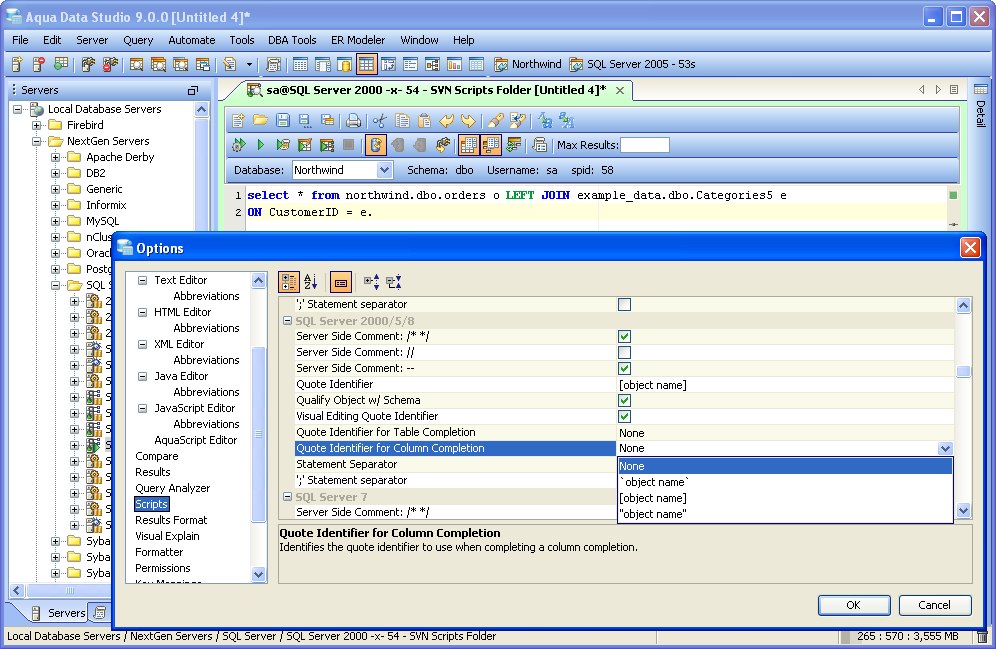 Cross Database Autocompletion - Autocompletion for SQL Server, Sybase, MySQL and Informix has support for completion accross databases. Indicating a table which is in a database other than the current database will provide column completion for the correct table. Autocompleting for tables in databases other than the current one will also complete correctly. Below are some examples: |