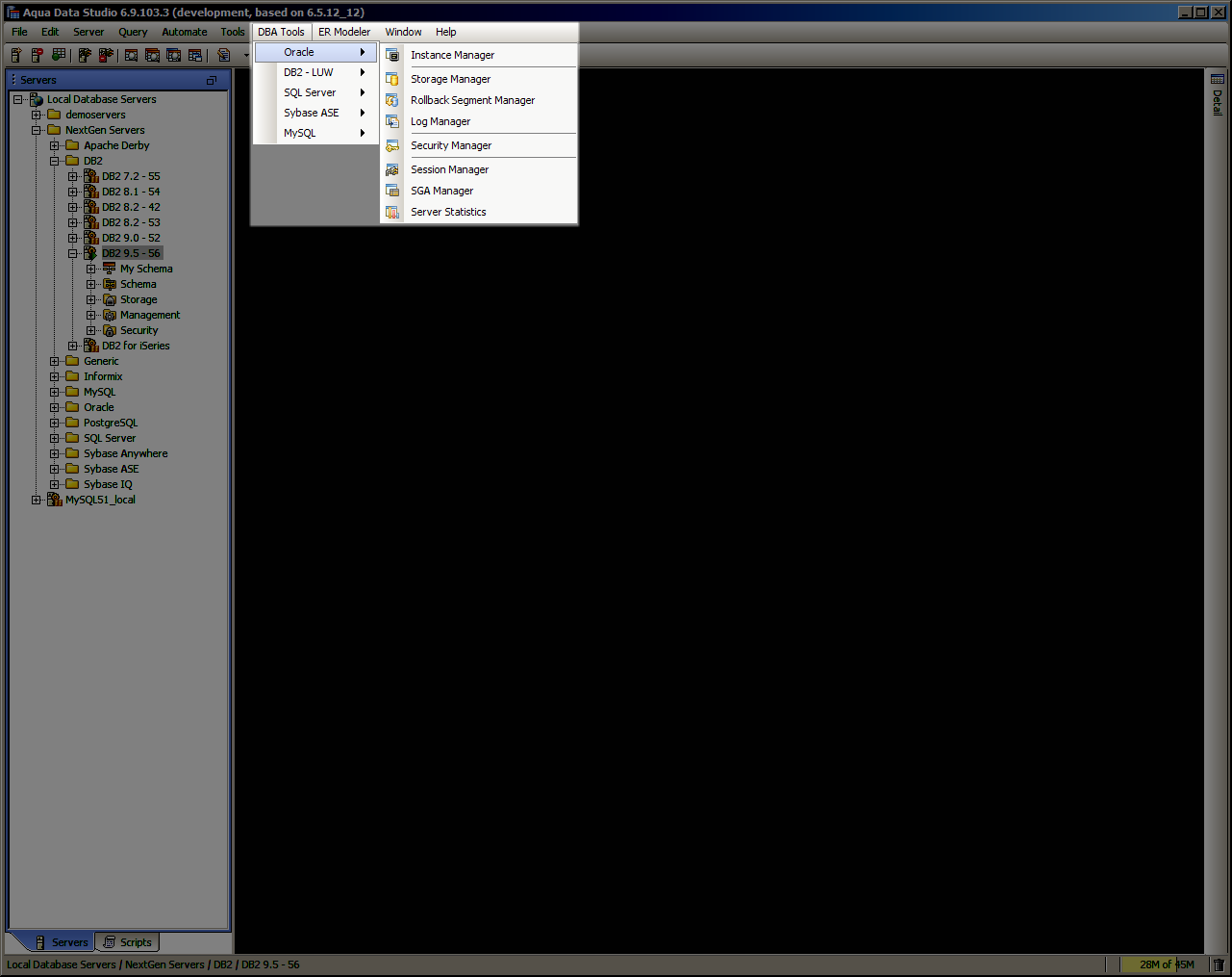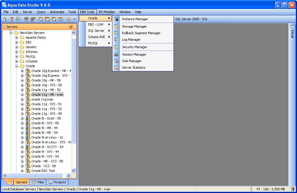 Oracle Database Administration Tools Aqua Data Studio provides database administration tools for the Oracle database. To access the Oracle DBA Tools, you may use the Application menu under DBA Tools->Oracle->[Tool]. You may also access the Oracle DBA Tool by selecting the context popup menu on the schema browser and select DBA Tools->[Name]. The tools consist of 8 tools to manage every aspect of an Oracle database. The tools include: