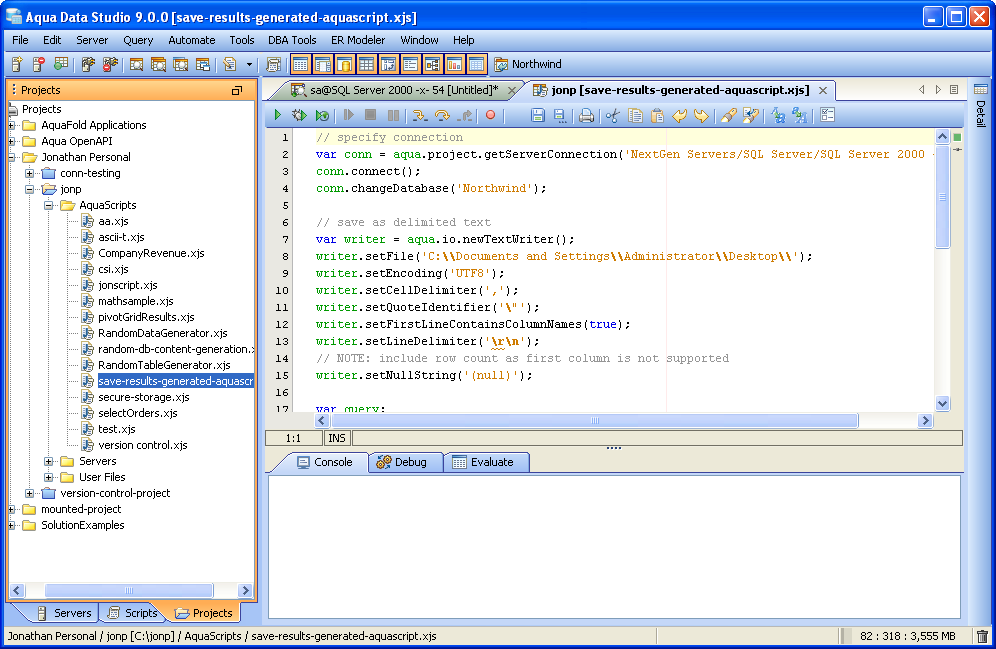 With the Query Analyzer's Save Results feature, results of a statement execution can be saved to a variety of different file formats or copied to the clipboard for reuse or pasting elsewhere. The Save Results dialog can be launched by right clicking within a Query Results window and selecting "Save Results" from the popup menu. It can also be launched by clicking the Save Results icon, a floppy disk with a grid overlay, in the Query Analyzer Toolbar to the left of the Print icon. The Save Results allows a wide variety of formats including, Delimited Data, INSERT statements, XML, HTML, and Excel worksheets. Selected Results can also be sent directly to the clipboard by clicking the "Save To Clipboard" button in the Save Results dialog. (Data Format for Excel does not save to clipboard). For cases where large results sets (100,000 rows or more) are being dealt with, it is best to use Save Results instead of Save To Clipboard. Copying a large result set to the clipboard dramatically increases the RAM in use. Save Results streams data directly to disk and it is highly recommended that "Save Results" or Export be used instead of copying large amounts of data from a Grid Result. Using the Operating System's clipboard for a large copy effectively doubles the amount of RAM in use because the Grid Result is already holding those items in memory. Saving to a file uses much less RAM, as a file is streamed to disk instead of being kept whole in memory. Below are the steps for Save Results and a list of all of its options and settings.