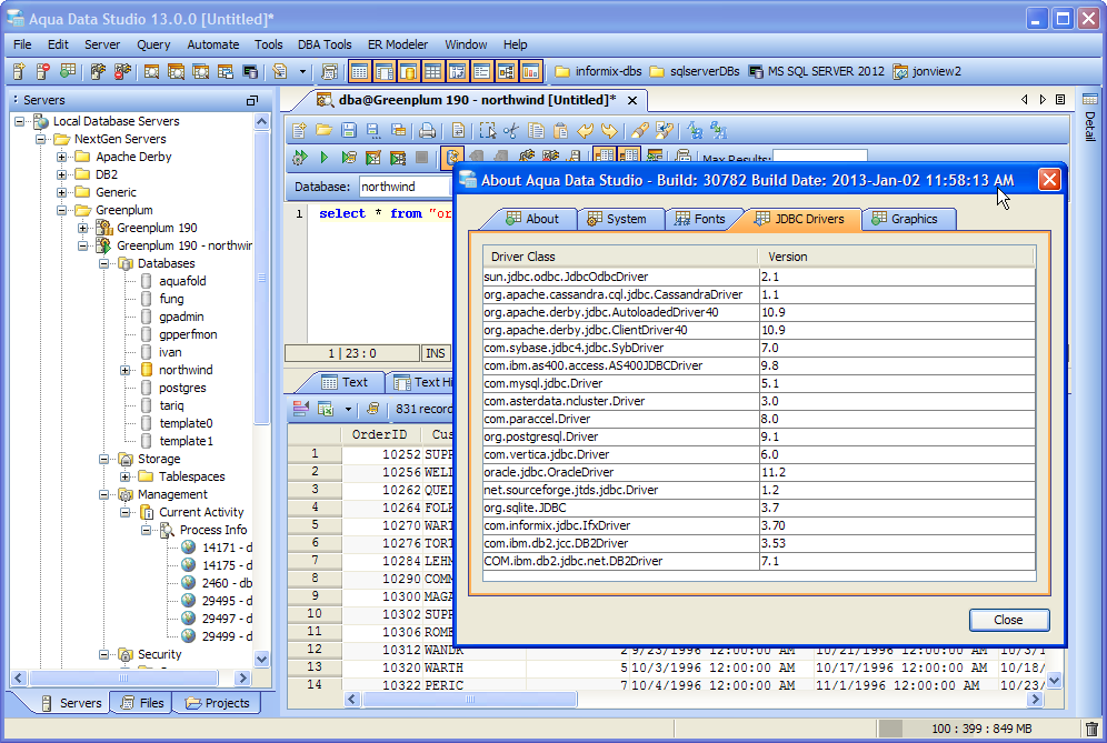 Aqua Data Studio uses JDBC drivers to make database connections to the appropriate database. By default, Aqua Data Studio comes packaged with an appropriate JDBC driver for all supported databases except Netezza, SAP Hana, Teradata, Teradata Aster and Vertica. These may be downloaded directly from the vendor. The included drivers work for most database versions and setups. In specific configurations, you may be required to update the JDBC driver in your Aqua Data Studio installation with the latest driver from the database vendor.