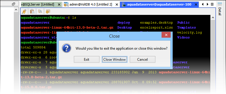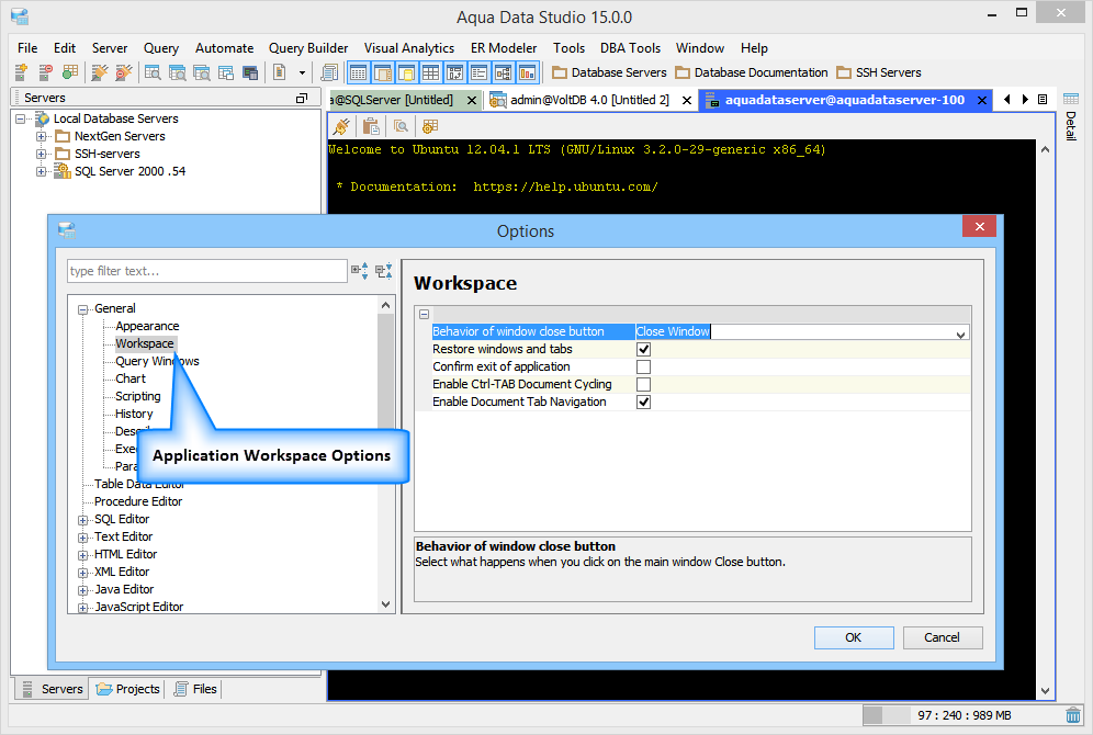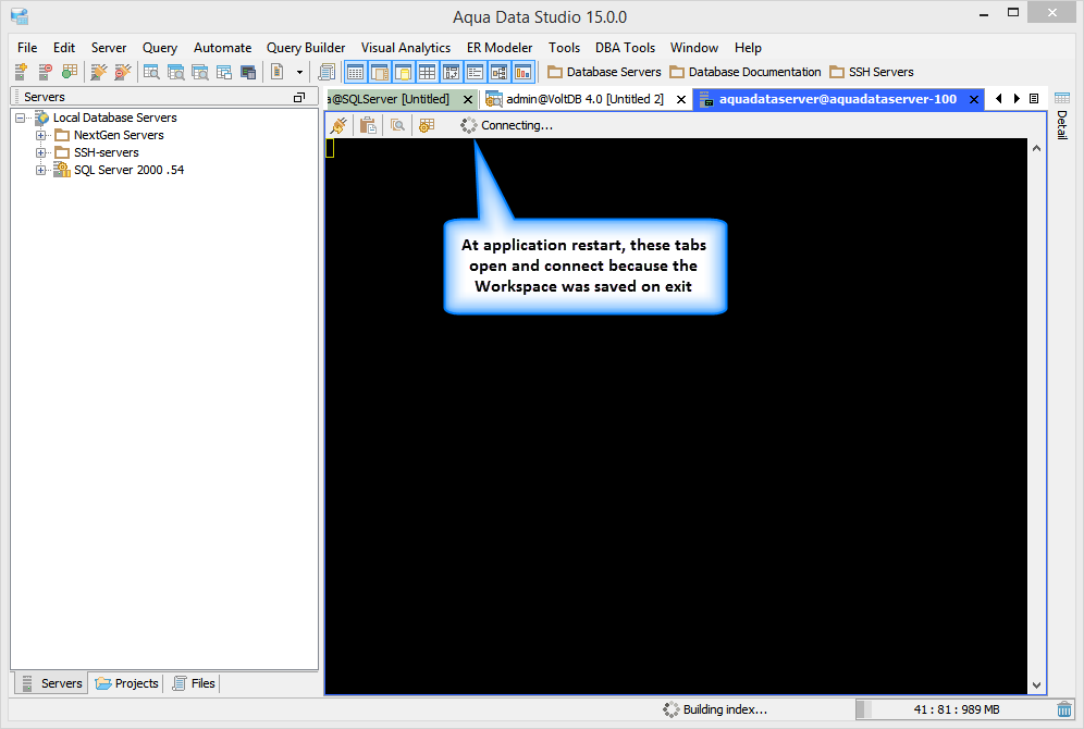 Working in complex Enterprise environments requires users to open multiple application frames and numerous Query and SSH windows to do their work. Once a user has configured his workspace, productivity reaches optimal levels. It is inefficient and frustrating for users to manually reconfigure their workspace each time the application is restarted or in the case of the application unexpectedly closing. It gets even more difficult to create a standard workspace for a user who has to work from office and home or who uses multiple computers. For these reasons, we have now included the functionality to save and reload the user's workspace in Aqua Data Studio v10.0.