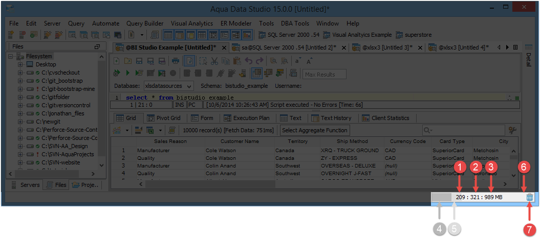Aqua Data Studio includes a Memory Monitor which displays a live chart of the application's memory usage, the current maximum memory allocated to the application and an explanation of Max Memory, Total Memory and Used Memory. To launch the Memory Monitor, double click on the memory usage statistics in the Memory Statistics display at the bottom right corner of the application window. The resulting window indicates whether the 32bit or 64bit version of the application is in use.