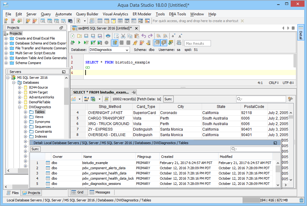 Other tools within Aqua Data Studio, such as Visual Analytics, the Entity Relationship (ER) Modeler, the Git Client, CVS and SVN Repository Browsers, the Execution Monitor, the Explain Whiteboard, and the Query Builder launch within their own windows but do not prevent access to the Main Application Window. The Entity Relationship (ER) Modeler also has its own docking framework which functions nearly the same as the main application docking framework and layout.
