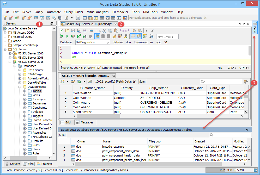 The Detail View displays relevant content of the item currently selected in the Schema or Files Browser. The Detail View offers quick, sortable views of Schema Objects or Files Browser directory contents. The Details View can be separated from the framework as a window. The Quick Filter on the top right of the Detail View allows for rapid filtering of retrieved content. Quick Filters are present throughout the application to assist in finding specific information in large lists. Immediately to the left of the Quick Filter search input field are statistics on the number of items displayed out of items retrieved.