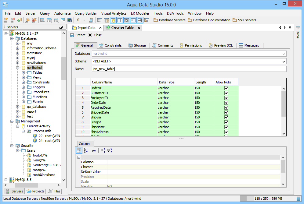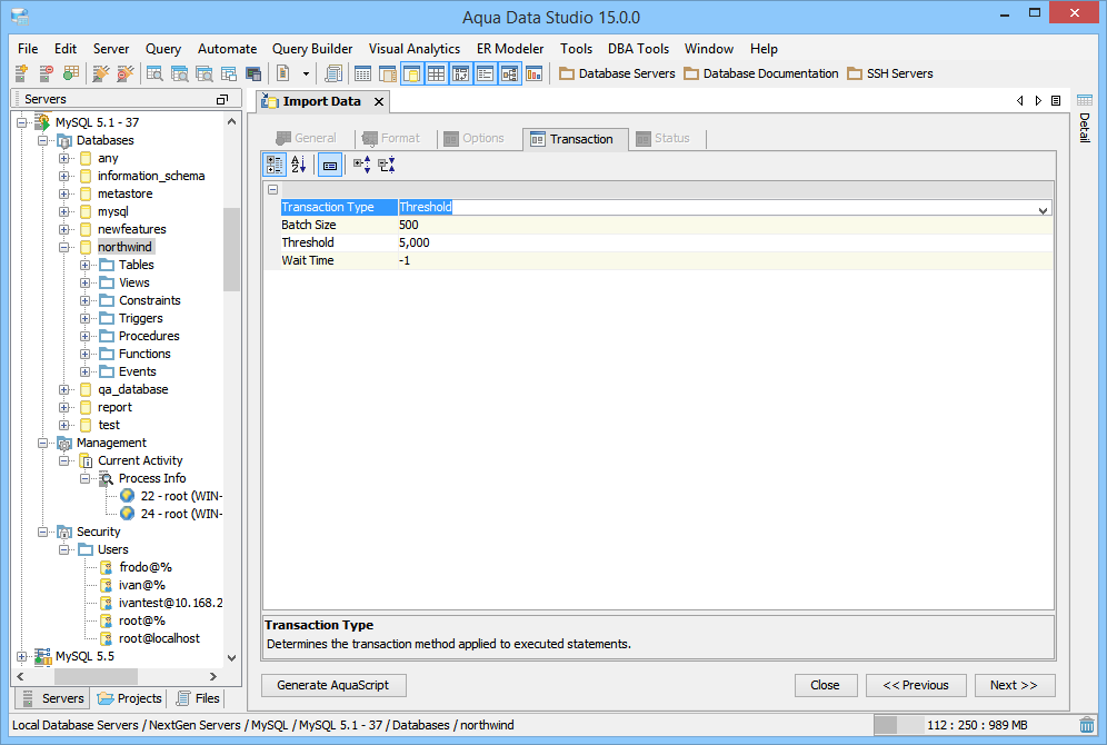 The Import Data Tool allows data of different formats to be imported and inserted into databases, tables and files. The following steps describe how to use the Import Data Tool. Import will not work for Generic JDBC or Generic ODBC connections 1. Select Tools->Import Data from the Menu bar. This will prompt you to choose a server in which to import data. Navigate and select your server and click ok. This will bring up the Import dialog. It is also possible to right click within the schema browser and select Tools->Import Data to launch the Import Tool. 2. The first tab in the Import Data dialog window is the General Tab. Browse and select the file to import. Once the file is selected a sample of the file will be displayed in the bottom grid to indicate how it will form columns on import. Then, select the encoding and platform the file is formatted in. The sample columns will be refreshed as the options are changed. Select whether the file is delimited or has fixed width columns. If the file has fixed width columns, type the widths of columns separated by commas (eg: 15,25,35,60 ). While typing the column widths the sample data will not change, so make sure to click on the Fixed Width radio box to refresh. Select whether the first row in the file contains the column names to help the import tool map to the table. Last, select the quote identifier for data values. Make sure the sample data being displayed is formatted correctly before proceeding, then click next. 3. In the Format Tab, select the database, schema and table in which to import the data. To import into a new table, click on the "..." button which will open a Create Table dialog (see the Create Tables page for more) with the columns defined in the sample file. If needed change the names and datatypes of the columns in the table and then click ok. At this point, it is possible import into the newly created table. If the sample file contains the column names of the values, Aqua Data Studio will make an attempt at matching the column names of the import file to the names of the columns of the table. It is possible to reorder the column mapping by changing the Position column value to match the column number in the sample file, or remove the position value to exclude the column from being imported. Once all columns are mapped, click on Create in the left upper corner of the Create Table dialog. This will take you back to the Format dialog (with your table details appropriately adjusted). Continue by clicking the Next button. 4. In the Options Tab begin by selecting whether "(null)" text values are to be converted to NULL values. Then, select the format of the dates & time. Date and time values will be formatted in the text file to be imported into date/time columns. If a date string is to be imported into a VARCHAR column then the format does not apply. There is an option to import directly into the database, or generate an SQL file with INSERT statements to import into the database. A sample of the file's values are provided below for configuring the date/time formats. When ready, click the Next button to import the data. If the Import Tool is being used to generate a script file for use in Aqua Data Studio's Query Analyzer, it is strongly suggested that the statement separator "GO" be selected. 5. In the Transaction tab select the type of transaction, Batch Size, Threshold and/or Wait Time that best suits your environment. By default, Transaction Type is set to Full so that the Import takes place in a single transaction. The Transaction Type of Batch allows indicating a specific number of records per transaction by entering a number in the Batch Size field. The Transaction Type of Threshold allows executing a specific number of transactions within a specified number of milliseconds as indicated in the Threshold field. Wait Time is used to pause between transactions, and, if set to -1, will not wait between transactions.