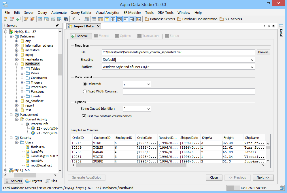 The Import Data Tool allows data of different formats to be imported and inserted into databases, tables and files. The following steps describe how to use the Import Data Tool. Import will not work for Generic JDBC or Generic ODBC connections 1. Select Tools->Import Data from the Menu bar. This will prompt you to choose a server in which to import data. Navigate and select your server and click ok. This will bring up the Import dialog. It is also possible to right click within the schema browser and select Tools->Import Data to launch the Import Tool. 2. The first tab in the Import Data dialog window is the General Tab. Browse and select the file to import. Once the file is selected a sample of the file will be displayed in the bottom grid to indicate how it will form columns on import. Then, select the encoding and platform the file is formatted in. The sample columns will be refreshed as the options are changed. Select whether the file is delimited or has fixed width columns. If the file has fixed width columns, type the widths of columns separated by commas (eg: 15,25,35,60 ). While typing the column widths the sample data will not change, so make sure to click on the Fixed Width radio box to refresh. Select whether the first row in the file contains the column names to help the import tool map to the table. Last, select the quote identifier for data values. Make sure the sample data being displayed is formatted correctly before proceeding, then click next. 3. In the Format Tab, select the database, schema and table in which to import the data. To import into a new table, click on the "..." button which will open a Create Table dialog (see the Create Tables page for more) with the columns defined in the sample file. If needed change the names and datatypes of the columns in the table and then click ok. At this point, it is possible import into the newly created table. If the sample file contains the column names of the values, Aqua Data Studio will make an attempt at matching the column names of the import file to the names of the columns of the table. It is possible to reorder the column mapping by changing the Position column value to match the column number in the sample file, or remove the position value to exclude the column from being imported. Once all columns are mapped, click on Create in the left upper corner of the Create Table dialog. This will take you back to the Format dialog (with your table details appropriately adjusted). Continue by clicking the Next button. 4. In the Options Tab begin by selecting whether "(null)" text values are to be converted to NULL values. Then, select the format of the dates & time. Date and time values will be formatted in the text file to be imported into date/time columns. If a date string is to be imported into a VARCHAR column then the format does not apply. There is an option to import directly into the database, or generate an SQL file with INSERT statements to import into the database. A sample of the file's values are provided below for configuring the date/time formats. When ready, click the Next button to import the data. If the Import Tool is being used to generate a script file for use in Aqua Data Studio's Query Analyzer, it is strongly suggested that the statement separator "GO" be selected. 5. In the Transaction tab select the type of transaction, Batch Size, Threshold and/or Wait Time that best suits your environment. By default, Transaction Type is set to Full so that the Import takes place in a single transaction. The Transaction Type of Batch allows indicating a specific number of records per transaction by entering a number in the Batch Size field. The Transaction Type of Threshold allows executing a specific number of transactions within a specified number of milliseconds as indicated in the Threshold field. Wait Time is used to pause between transactions, and, if set to -1, will not wait between transactions.