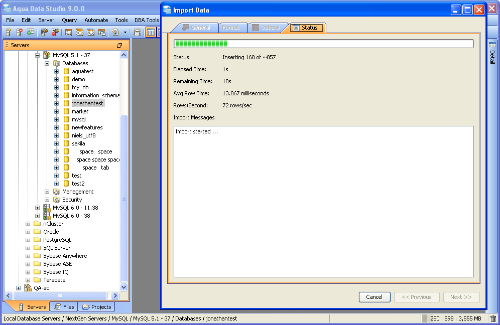 6. Once the Status Tab takes focus, the import has begun. It is possible to cancel the import at any time by clicking on the cancel button at the bottom of the dialog. If any errors or warnings occur, they will be displayed in the message text window. Date and time formats are specified by date and time pattern strings. Within date and time pattern strings, unquoted letters from ’A’ to ’Z’ and from ’a’ to ’z’ are interpreted as pattern letters representing the components of a date or time string. Text can be quoted using single quotes (’) to avoid interpretation. "’’" represents a single quote. All other characters are not interpreted; they’re simply copied into the output string during formatting or matched against the input string during parsing. For more information on how to configure Date, Time and Date/Time formats (including user customized formatting) throughout Aqua Data Studio, see the Options for Date Time and Date/Time.