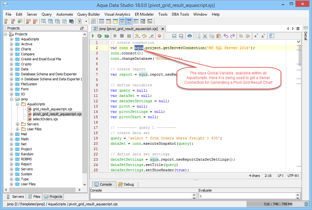 Open API Script Examples: A downloadable standard set of scripts is available for the application and contains examples of all the functionality available through Aqua Data Studio's Scriptable Open APIs. If you need to see how to implement a specific API Package, explore the Script Examples and edit them for your particular scenario.