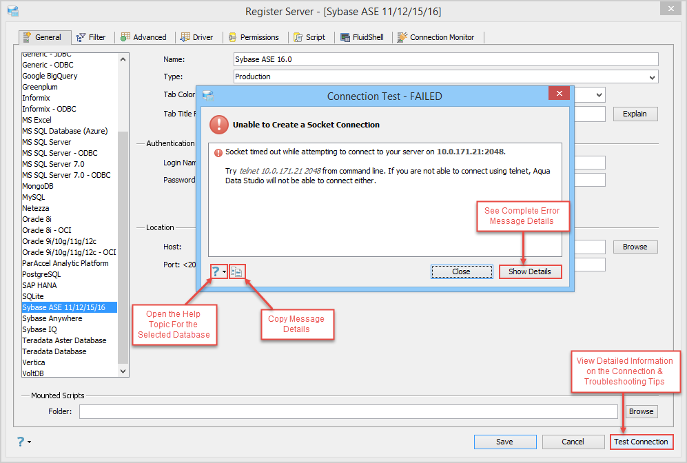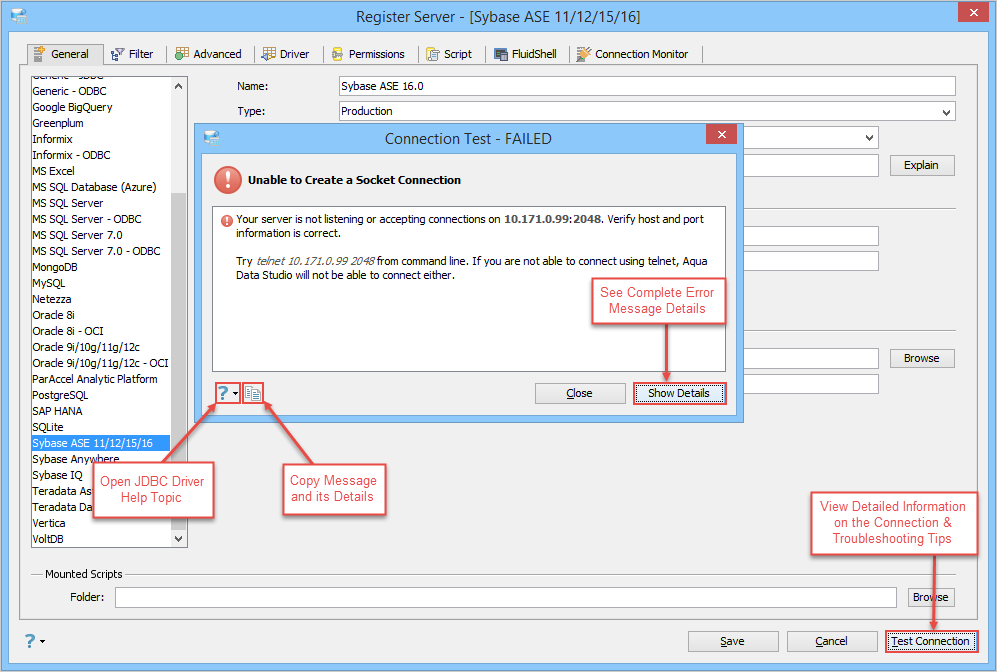 There are defaults set for the different RDBMSes within the Register Server Dialog, depending on the database vendor and version chosen. Usually, use these defaults. There is variation in how different database types are registered and have the correct drivers. For more information, see JDBC Drivers.