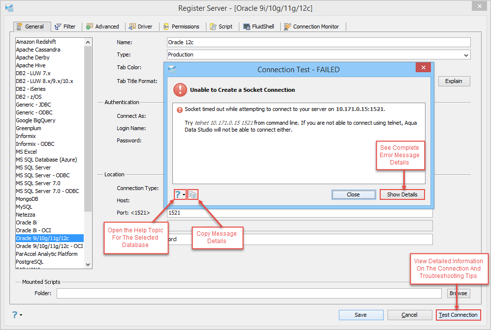 The title at the top of the Register Server, Edit Server and Server Properties dialogs indicate the RDBMS driver (the server type) in brackets, followed by a hyphen and the connection name in parenthesis to assist in troubleshooting. If you are not sure what connection type you are using, look at the title text. For example, a connection to an Oracle 11g server, with the name "My Connection," would appear as [Oracle 9i/10g/11g] - [My Connection].