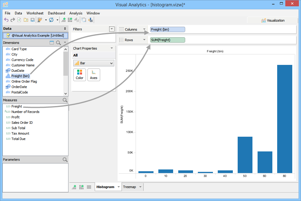 5. After your Bins for Freight are created, select Bar from the Chart Type dropdown in the Chart Properties
