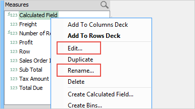 Right-click a Calculated Field and then click Edit to make changes in the Calculated Field. Also, you can change the name of the Calculated Field by selecting Rename.
