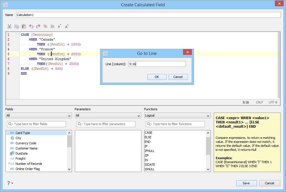 Go to Line navigates you to a specific line in the editor based on the user-defined number. You can view the current line and column number in the Status Bar. The line and column number are separated by a colon. To navigate to a specific line, click CTRL+G (Command key on Mac) and open the Go To Line dialog. Type the new line and column number separated by a colon, and then click OK.
