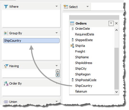 The [Group By] Deck can be used to create a GROUP BY clause by adding, removing or reorganizing columns which are dropped from the table diagrams. When a column is dropped in the [Group By] Deck, the SQL Pane reflects its presence immediately.