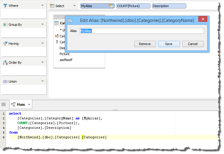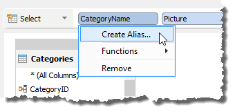 After entering the text for your Alias and clicking [OK], the item name will change to display the Alias text you used. The Alias Icon will appear to its right. The SQL Pane reflects the Alias use in your SELECT statement as well.