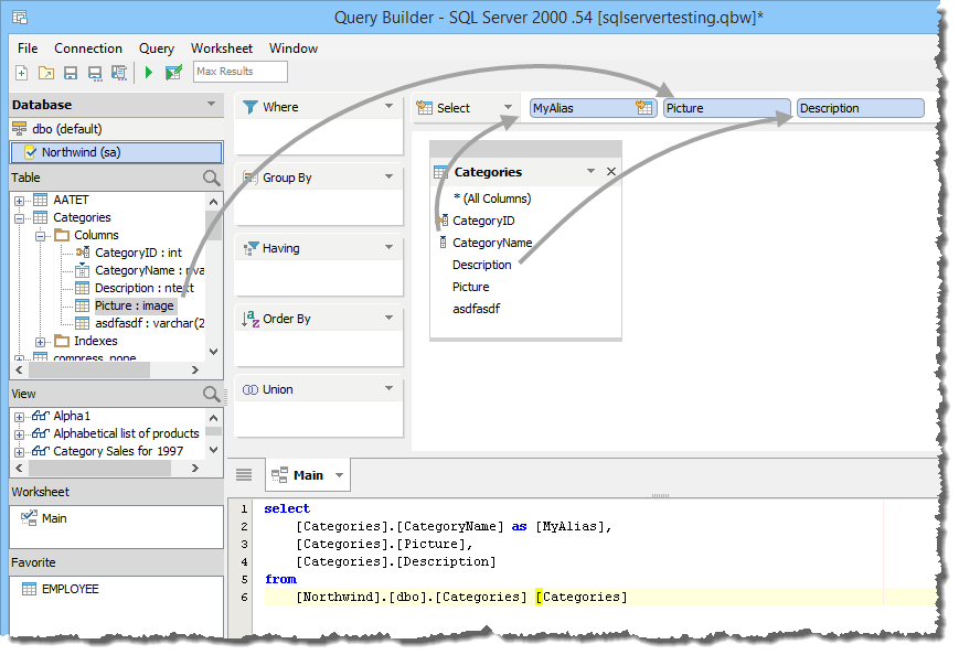 The quickest way to create a SELECT is to drop a column, table, view or alias into the [Select] Deck. Once items are in the [Select] Deck you can drag to rearrange their order within the select statement created in the SQL Pane. Items dragged to the left appear first in SQL statements in the SQL Pane. If an Alias is present in the [Select] Deck an Alias Icon appears on its right side to make distinguishing Aliases from unaliased objects easier.