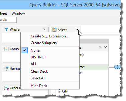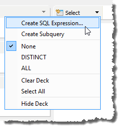 Left clicking the menu triangle in the [Select] Deck allows you to Create SQL Expressions, Create Subqueries, choose [DISTINCT] or [ALL] (or other options depending on vendor), [Clear the Select Deck] of all items, [Select All] items on the [Select] Deck or [Hide] the deck.