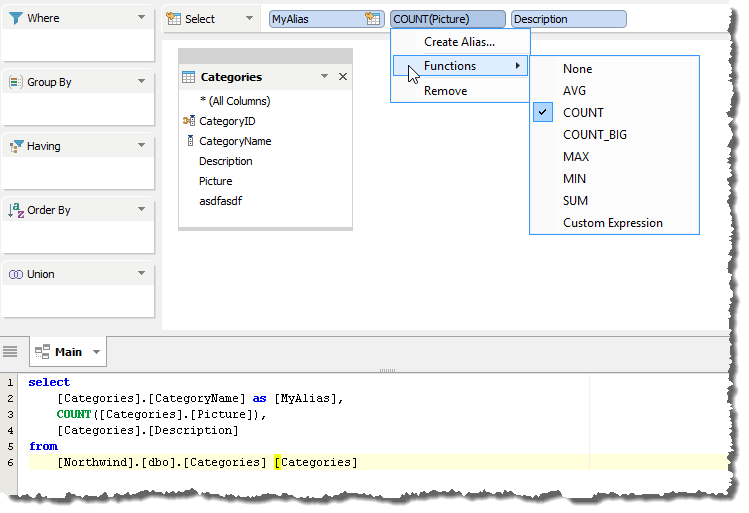 To create a Column Expression in the [Select] Deck, right click on a column within it and select [Function]. You will see a list of the available functions such as [AVG, COUNT, COUNT_BIG, MAX, MIN] and [SUM]. This list of functions varies based on the vendor and version of database you are connected to. If you choose [COUNT], you notice that the column name changes in the Select Deck to reflect the Function that has been selected. It will appear as COUNT(column_you_dragged).