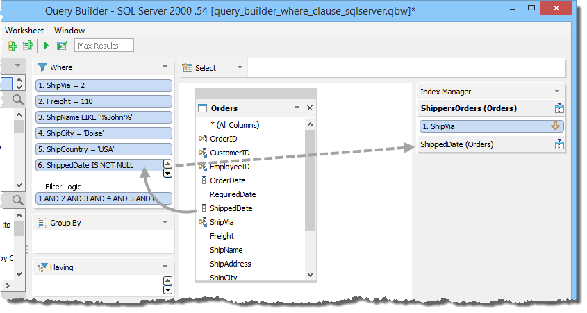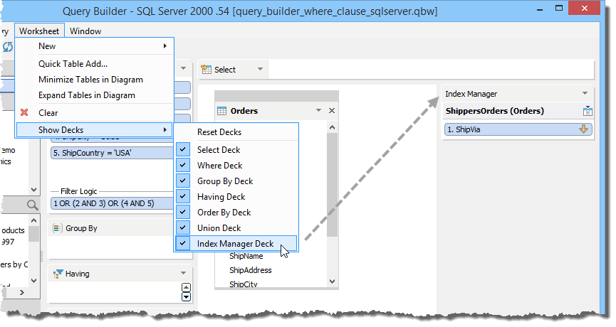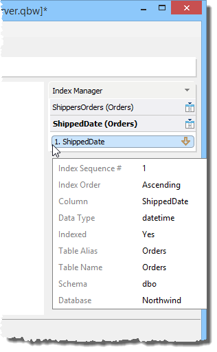With the Index Manager enabled, drag columns from any deck or the Data Pane into the Where Clause Deck. The Index Manager will display the Indexes for that column.