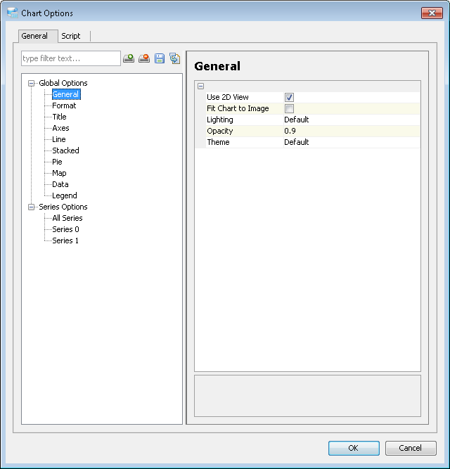 Chart Options for Aqua Data Studio contain a complete set of variables and values to alter the chart as needed, including background color, chart title, label distance, axis titles, category axis number format and much more. Series Options ( Advanced Chart Options ) information is presented at the bottom of this page. It is possible to search the chart options using the field at the top left of the Chart Options Dialog. Any matching text found in an option section ( Format, Title, Axes, etc.), option name or option description gets highlighted in the section and bolded to make it easy locate where your search term has been found.