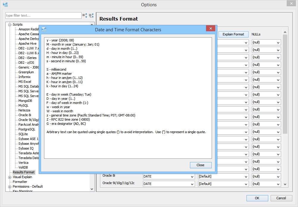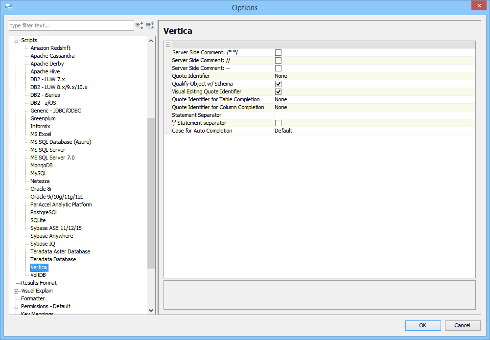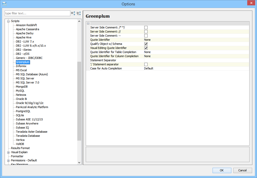 Scripts and Results Options determine settings for scripts (including server side comments, quote identifier and statement separator settings) and Query Results display settings (including data type formatting).