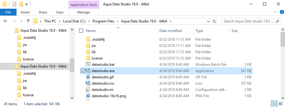 Notice that there are two installations of Aqua Data Studio in the screenshot below. This illustrates how it is possible to have a current version and an older version installed. The two cannot be run simultaneously.
