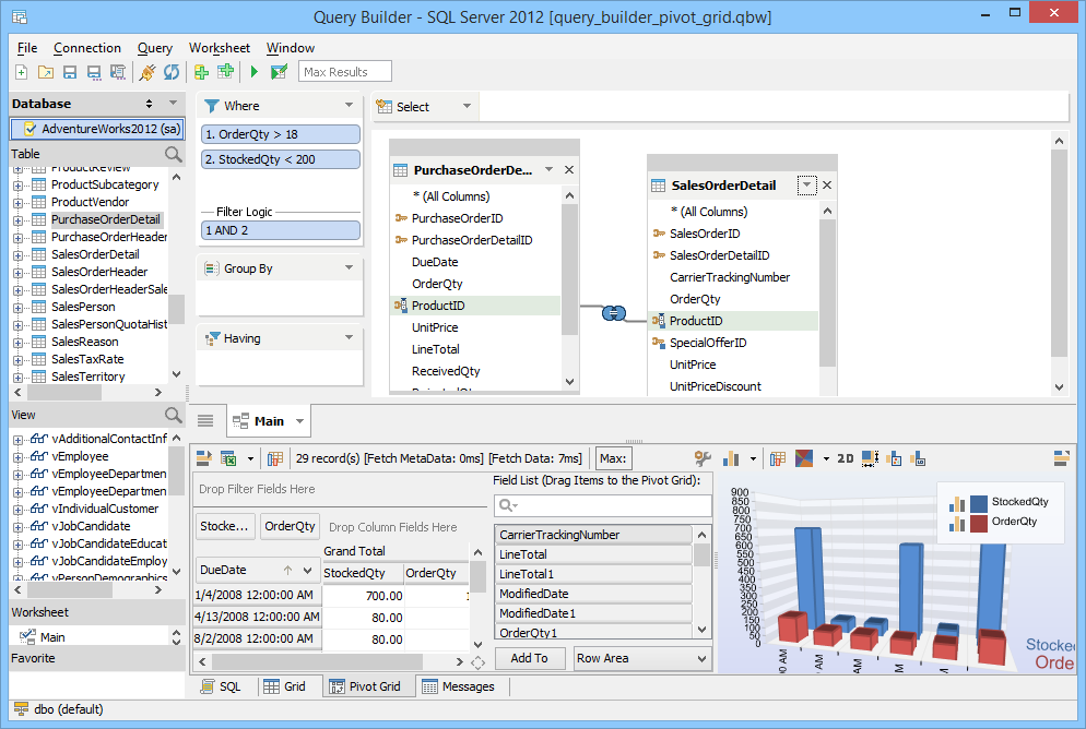 Grids, Grid Charts, Pivot Grids and Pivot Grid Charts are available through the Query Analyzer Window as tabs (when enabled in the Main Application Toolbar) for any queries run on any database Aqua Data Studio can connect to. Grid Results are the most common method of desplaying query results, and they are also the recommended method of displaying large results sets (100,000 rows or more) as memory consumption for them have been highly optimized. Other features of the Grids Results include sorting, column rearrangement, quickfiltering displayed results, aggregate functions on selected cells, Script to Window for AquaCommands, Save As, View in Excel Viewer, Grid Printing and Charting. It is also possible to save charts as AquaScripts within AquaProjects by right clicking on them. Grid results displays data from tables and queries within a grid that can be sorted and rearranged. Column data can be Sorted in descending or ascending order by left clicking on column headers. If the Control key (CTRL) is depressed during sorting, multiple columns can be sorted in sequence. Resorting columns also changes how the chart displays.
