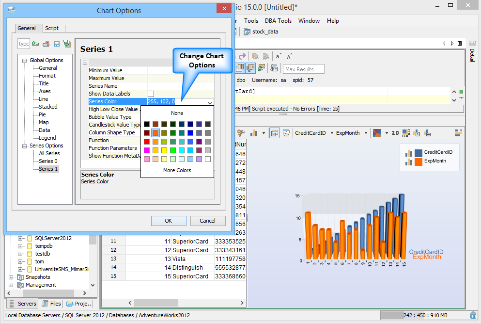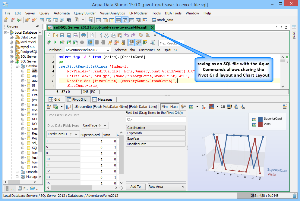 1. Connect to the Database Server and Open a Query Analyzer. Execute the Query. Click on the Pivot Grid Tab and click on Show Chart. 2. Drag Fields from the Fields list on the right into the Row Field area in the Pivot Grid's left side where it displays "Drag Row Fields Here" 3. Drag Fields from the Fields list on the right into the Column Fields area at the top of the pivot Grid where it displays "Drag Column Fields Here". 4. In the Chart display Area, select Column Chart Type. Change Chart Type if needed by selecting Column Chart, Stacked Chart, Bar Chart, Area Chart, Pie Chart, Line Chart or Surface Chart. The Chart Type can be set per series by clicking on the legend and choosing a different type. 5. Edit the Column Fields as needed. CardType is the Column Field and in the drop down, only 2 items from CardType are selected so that the columns are returned on the basis of this filter. 6. Select the Chart Type in the Chart Display Area. The Chart view can be freely rotated in three dimensions by left clicking and dragging the mouse across the chart. To zoom in and out, hold down shift and left click and drag up and down across the chart. To reposition the chart, Ctrl + drag moves the chart within the view. 7. Review the Aqua Commands script this chart would create within the Chart Options Script tab. If this script were shared with Aqua Data Studio users, they would see an identical chart layout. Just like the Grid Results Charts, a right click on the Chart allows saving as an image which can also be emailed. 8. Right click and select View in Excel Viewer to see how the Pivot Grid displays in Excel. 9. View the Pivot Grid viewed within Excel. 10. To save the Pivot Grid and the associated Pivot Grid Chart as an Excel Worksheet, right click in the Pivot and select Save Results or click the Save Results Icon. 11. To generate Aqua Commands to script both the Pivot Grid layout and Pivot Grid Chart, right click in the Pivot Grid and select Script to Window. Saving the Query Analyzer Window contents as a file preserves the layout and settings for later use. 12. Select Pivot Grid Options as needed, any changes take place immediately in the chart. Executing the contents of the Query Analyzer will update the chart and grid with any data that has changed since the previous execution. 13. Aggregate Functions like Sum, Count, Min, Max, Average, Standard Deviation are available for data selected from the Pivot Grid. 14. Just like the Grid Results Charts, a right click on the Chart allows saving as an image. 15. Save the Query and Aqua Commands script for generating the Pivot Grid and Pivot Grid Chart with layout for sharing or reuse. 16. Right click on a Pivot Chart to Generate an AquaScript. 17. Indicate a name and AquaProject to save it in. 18. The AquaScript Editor will open in a tab with that AquaScript. See the AquaScripts and AquaProject section for more information. Pivot Grid in Query Builder results - The Query Builder results also have a tab presenting the results as a pivot grid. The number of pivot grids corresponds to the number of result sets obtained when running the query. The pivot grids are displayed on a multi-level splitpane providing full control over sizes and configurations of each pivot grid. See the Query Builder section for more information. The Pivot Grid within the Query Builder has exactly the same functionality as the Pivot Grid launched from the Query Analyzer. |
