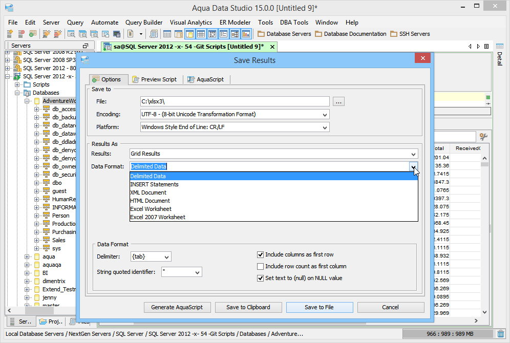 With the Query Analyzer's Save Results feature, results of a statement execution can be saved to a variety of different file formats or copied to the clipboard for reuse or pasting elsewhere. The Save Results dialog can be launched by right clicking within a Query Results window and selecting "Save Results" from the popup menu. It can also be launched by clicking the Save Results icon, a floppy disk with a grid overlay, in the Query Analyzer Toolbar to the left of the Print icon. The Save Results allows a wide variety of formats including, Delimited Data, INSERT statements, XML, HTML, and Excel worksheets. Selected Results can also be sent directly to the clipboard by clicking the "Save To Clipboard" button in the Save Results dialog. (Data Format for Excel does not save to clipboard). For cases where large results sets (100,000 rows or more) are being dealt with, it is best to use Save Results instead of Save To Clipboard. Copying a large result set to the clipboard dramatically increases the RAM in use. Save Results streams data directly to disk and it is highly recommended that "Save Results" or Export be used instead of copying large amounts of data from a Grid Result. Using the Operating System's clipboard for a large copy effectively doubles the amount of RAM in use because the Grid Result is already holding those items in memory. Saving to a file uses much less RAM, as a file is streamed to disk instead of being kept whole in memory. Below are the steps for Save Results and a list of all of its options and settings.
