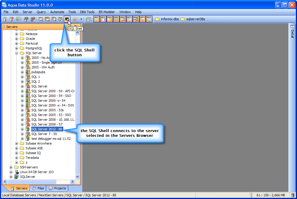 :$ select order_id, product_name, quantity :$ from orders :$ limit 5 :$ go order_id product_name quantity ----------- --------------- ----------- 01012007-72207-847 Aqua Data Studio v6.0 [w/ One Year Subscription] 1 01012007-72207-ROWBOAT Aqua Data Studio v6.0 [w/ One Year Subscription] 1 01012008-72207-14343 Aqua Data Studio v6.5 [w/ One Year Subscription] 1 01012008-72207-1529 Aqua Data Studio v6.5 [w/ One Year Subscription] 1 01012008-72207-BLACKDUCK Aqua Data Studio v6.5 [w/ One Year Subscription] 1 5 record(s) selected [Fetch MetaData: 1ms] [Fetch Data: 0ms] [Executed: 9/11/2012 8:45:15 AM] [Execution: 1ms]