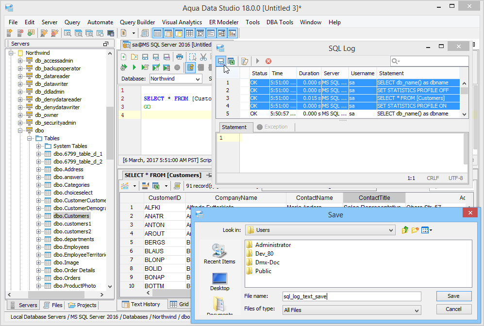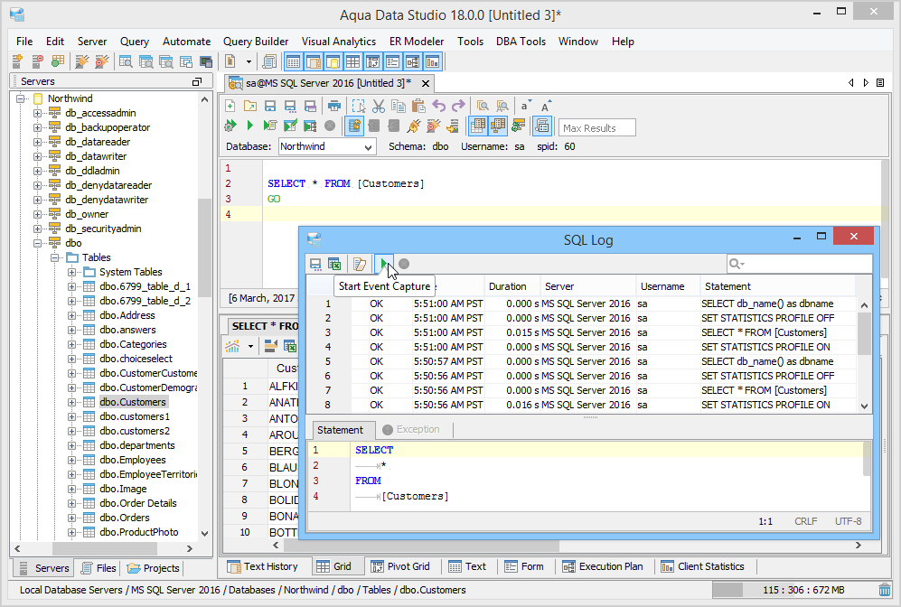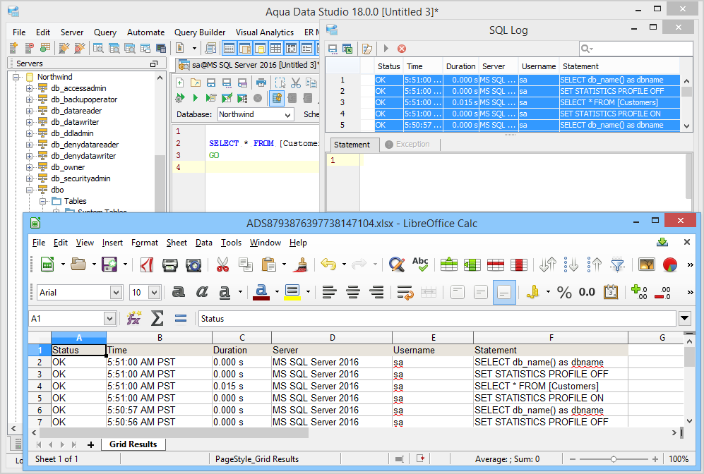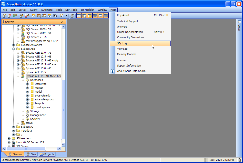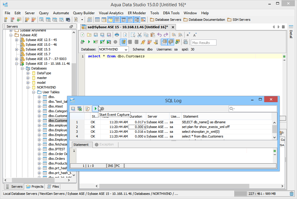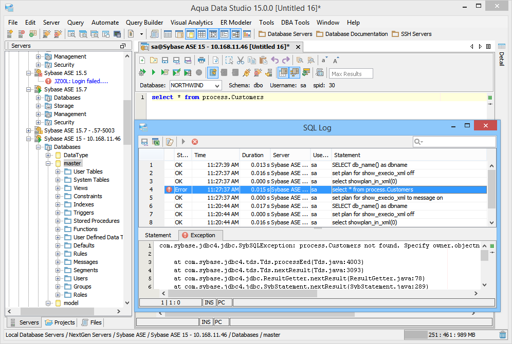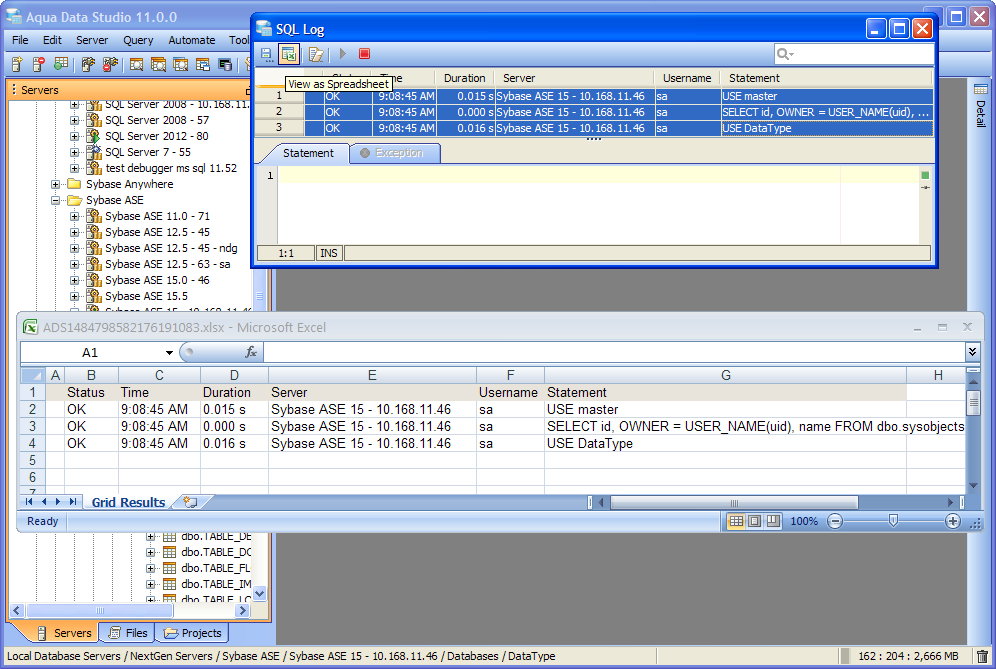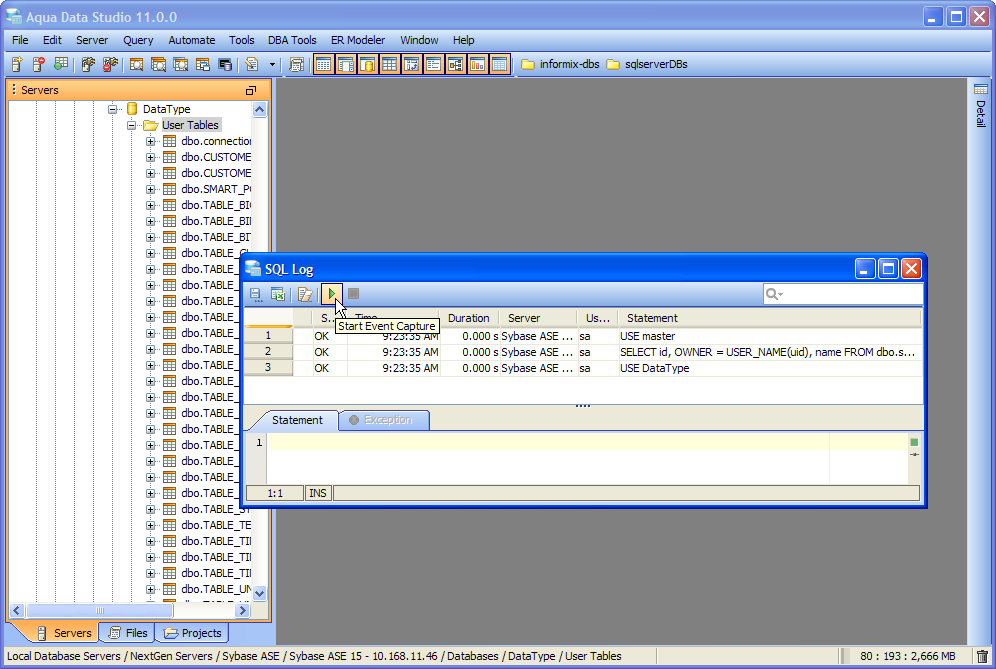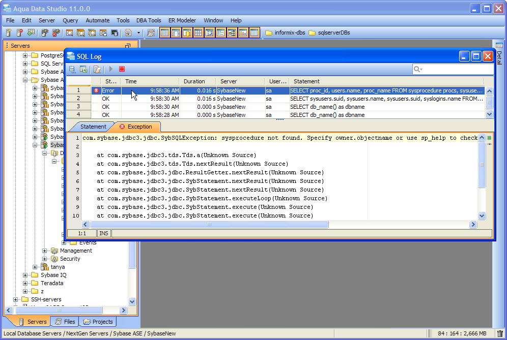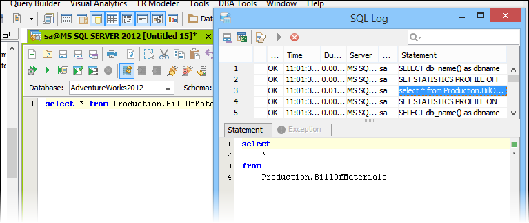 The SQL Log is a visual log tool for recording any SQL queries executed by Aqua Data Studio; all queries manually executed in the Query Analyzer by you the user and any of Aqua Data Studio's internal queries for displaying information within the GUI. When the SQL Log is opened, it immediately begins recording and provides a much more detailed capture of database interaction than the SQL History alone. If the Schema Browser is used to expand a database object to view its content, the SQL Log instantly displays the query the application uses to retrieve that information. This makes it an effective tool for monitoring the execution of statements within Aqua Data Studio.