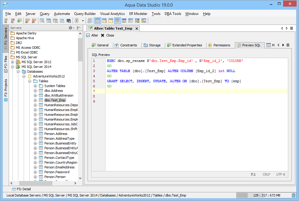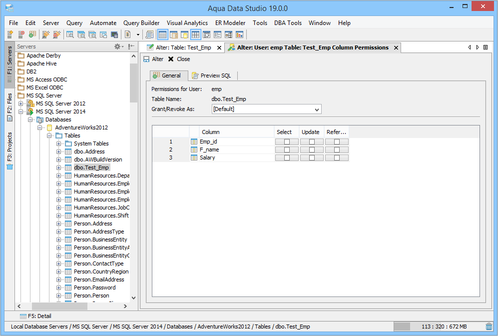 Once a table has been created, it is possible to use Aqua Data Studio's Visual Editing Tools to alter its properties. ALTER Altering tables through the GUI is also done with a right click menu on table objects in the schema browser. Right clicking on a table object opens the same popup menu as above, but to ALTER a table, select the second item in the list, "Alter Table". The resulting Alter Table window contains General, Constraints, Storage, Permissions and Preview SQL tabs across the top. Within the General tab, the table name, column names, datatypes and allow nulls can be changed. The Column information is sortable, expandable and displays more details about the selected columns. INSERT and DELETE of columns is available via right click on the Column Names within the General tab of CREATE and ALTER dialogs. The database and schema cannot be changed, and remain grayed out. Columns can be added (INSERT), deleted (DELETE) and changed (ALTER). Constraints and check conditions can be altered in the Constraints tab. Constraint properties details such as Name, Type, Ref Schema, Ref Table and Check Condition are modifiable visually. Constraint Definition Table Columns and Referenced Columns can be visually edited Storage information, just as above, can be altered in the Storage tab. The Storage tab provides details on Tablespace and table storage, its content vary depending on server vendor and version. Table Permissions (when privileges to do so have been granted to the current user in the server registration Permissions tab) can be altered and granted on the Permissions tab for column and command. Full grant options are available and all Permissions can be set by Grantee Type for Users, Groups or Roles depending on database vendor and type. Grant, Grant with Grant Option, Add Grant, Add Grant with Grant Option, and Revoke are available for SELECT, INSERT, UPDATE, DELETE across all databases. Depending on vendor supported functionality, there are other permissions which may be set such as ALTER, INDEX, References, On Commit Refresh, Query ReWrite The "Columns..." button at the bottom right of the Permissions tab, allows further permissions changes, including SELECT, INSERT, UPDATE, and References for the columns highlighted in the permissions grid within the Permissions tab. The Preview SQL tab displays the DDL used to alter the table based on the properties set within the other tabs. Below are the steps to alter a table.