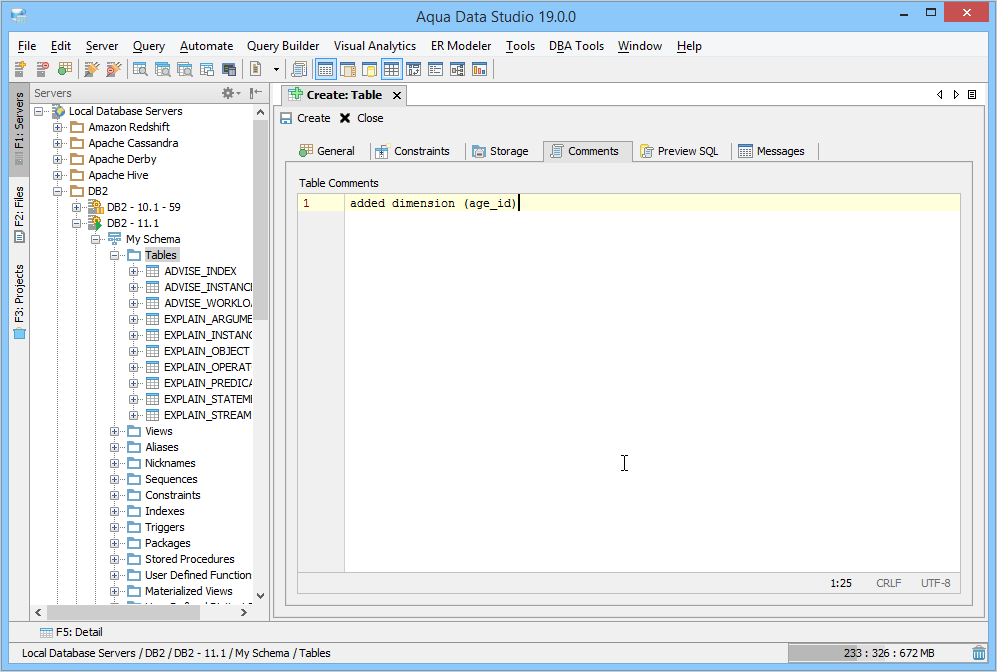 Aqua Data Studio contains GUI tools for visually editing and creating Tables. CREATE Creating tables through the GUI Tools available in the schema browser begins with opening a database server connection and expanding the tree to view the server's tables. Right clicking on the schema container for Tables generates the pop-up menu containing "Create Table" as its first item. The Create Table dialog has General, Constraints, Storage and Preview SQL tabs across the top. The General tab is where the table is named and its columns and datatypes are set. The Column information displays more details about the selected columns in the descriptin area below the column grid. INSERT and DELETE of columns is available via right click on the Column Names within the General tab of CREATE and ALTER dialogs. All of the datatypes available to the current database can be accessed with a dropdown next to the column names. The Constraints tab allows selection of columns for use in constraint creation (including Primary Key) and check conditions. Constraint properties details such as Name, Type, Ref Schema, Ref Table and Check Condition are modifiable visually. Constraint Definition Table Columns and Referenced Columns can be visually edited. For more on constraints, see the Creating Constraints page. The Storage tab provides details on Tablespace and table storage, its content vary depending on server vendor and version. The Comments tab provides space for text comments that will be stored with the table in the database. Some vendors also allow Table Column Comments, to make comments on specific columns. Where this is available, such comments will also appear ER Models containing tables with these properties. The Preview SQL tab displays the DDL used to generate the table and its properties based on the settings of the other tabs. Below are the steps used to create a table in DB2 10.1. Because other databases may not have dimensions, steps 6 and 7 may not be needed.