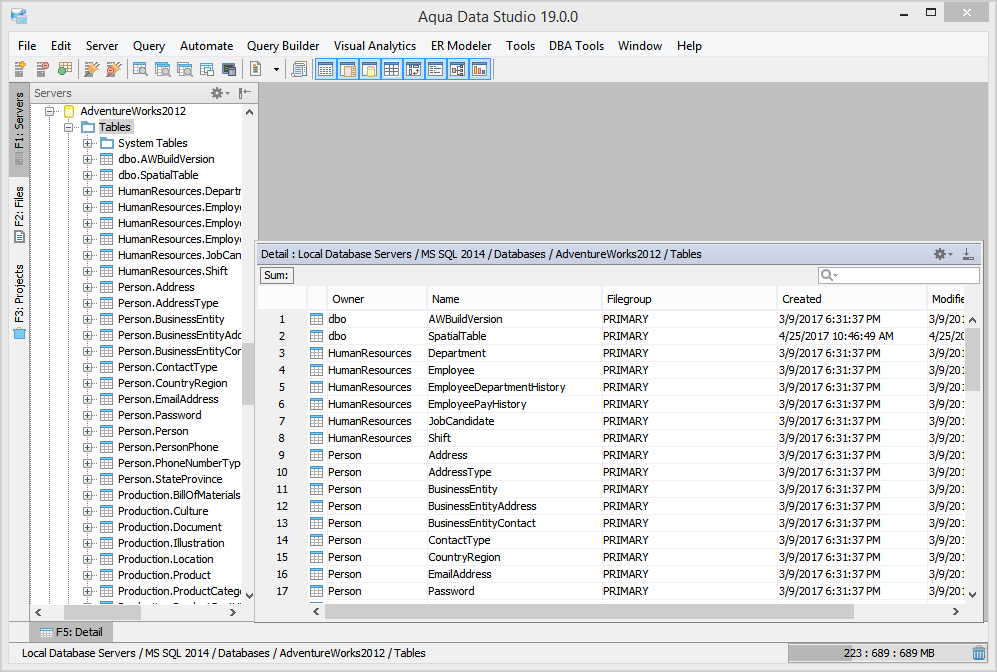 The Detail View displays relevant content of the item currently selected in the Schema or Files Browser. The Detail View offers quick, sortable views of Schema Objects or Files Browser directory contents. The Details View can be separated from the framework as a window. The Quick Filter on the top right of the Detail View allows for rapid filtering of retrieved content. Quick Filters are present throughout the application to assist in finding specific information in large lists. Immediately to the left of the Quick Filter search input field are statistics on the number of items displayed out of items retrieved.