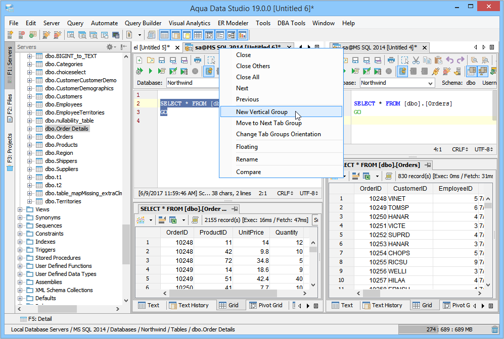 Editing of SQL Scripts, HTML, XML, JavaScript, Java, AquaScript and Text files are done in this pane. It is most frequently used as the Query Analyzer. Each document, script or SQL Query Analyzer displays in a separate tab. Just above the Document Pane and to the right of the "Show Script Detail" button is the Shortcut Toolbar, a convenient place to put shortcuts to frequently used Schema Objects from database connections in the Schema Browser. Vertical and Horizontal Groups are available to organize the Document Pane when multiple tabs or documents are open. Each panel tab can be dragged by its tab icon into a new position in the list of tabs. When more tabs exist than the application has a width to display, a list of those additional tabs is available to the right of the right-most tab. The arrows at the top right of the Document Pane can also be used to scroll left and right through the tabs. Right clicking on a tab brings up a menu for tab orientation, tab navigation, tab compare tools, tab closing, tab floating (undocking), and tab renaming. Dragging a file from the Files Browser into the Document Pane opens that file in its appropriate file editor with appropriate syntax highlighting.