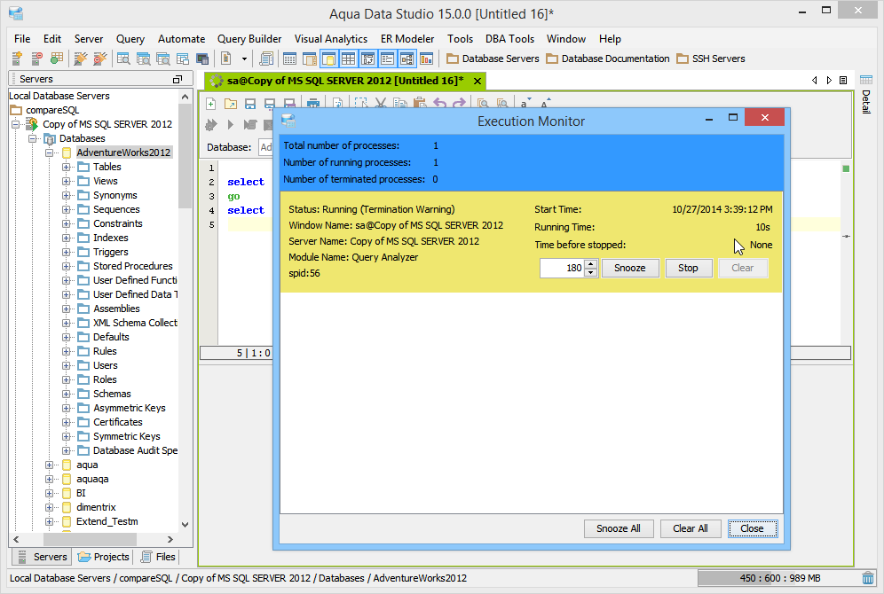 The Execution Monitor allows the user to see information (including SPID) on queries that are being run, including execution status, time, warning messages, total number of processes, number of terminated processes and more. It monitors the status of all the queries issued in Query Analyzer, Query Builder and Table Data Editor. The monitor has been designed in order to notify a user about long running queries so they can be canceled; and/or it can terminate those queries automatically, as those queries may unnecessarily consume valuable server resources. In the application options, the File->Options:General:Excution Monitor section sets options for the Execution Monitor such as query warning time, query stop time and snooze time. The user will be notified when a query runs beyond the warning time. Extending its running time by altering the snooze time will automatically stop the query once it reaches its stop time The monitor dialog opens automatically to warn the user when a query runs beyond the warning time. The user will be able to cancel this query, snooze it, let it run till it is stopped automatically, and clear the query information from the monitor once it’s stopped The user can also open the Execution Monitor from the Tools menu and see all of the queries currently running. The Execution Monitor displays information about the queries including SPID. By default, the Execution Monitor is disabled for queries running from the Table Editor as the table editing already handles long transactions. The user can enable it in the application options as File->Options->General->Execution Monitor: "Enable Execution Monitor for Table Data Editor". |
