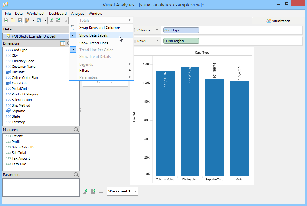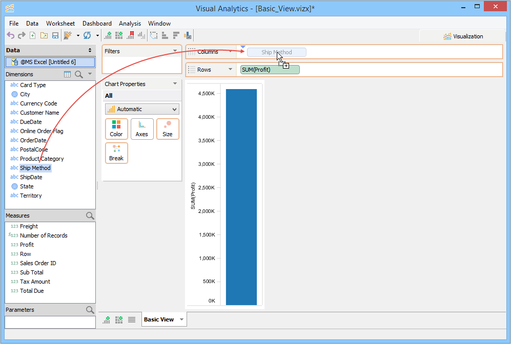 For this example, you will build a Basic View to display Profit by Credit Card Type based on the Visual Analytics Example xlsx file we connected to in the Building Views page. Perform the following steps to build the view.