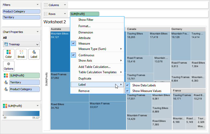 You can turn labels on and off for a measure placed in the columns/rows deck, by right-clicking the measure and pointing at Label and then turning on and off additional label options. For example, right-click Profits in Rows Deck > point to Labels > turn on Show Measure Values. Visual Analytics displays profit values of product categories for different territories.