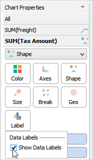 You can turn labels on and off for the entire chart view from the Visual Analytics toolbar (). For example, turning on this icon displays values for both the tax amount and freight in the chart view. Here, you will notice the Show Data Labels check box for All accordion is in the selected state.