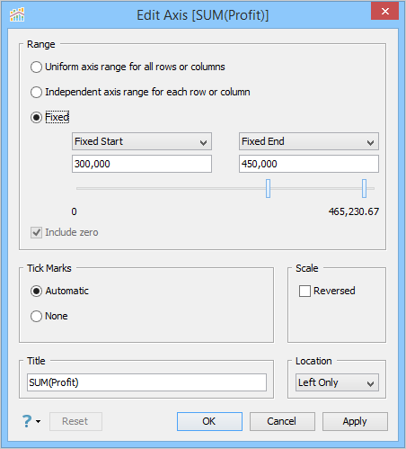 Visual Analytics sets an independent range for each row or column based on the minimum and the maximum values in the data.