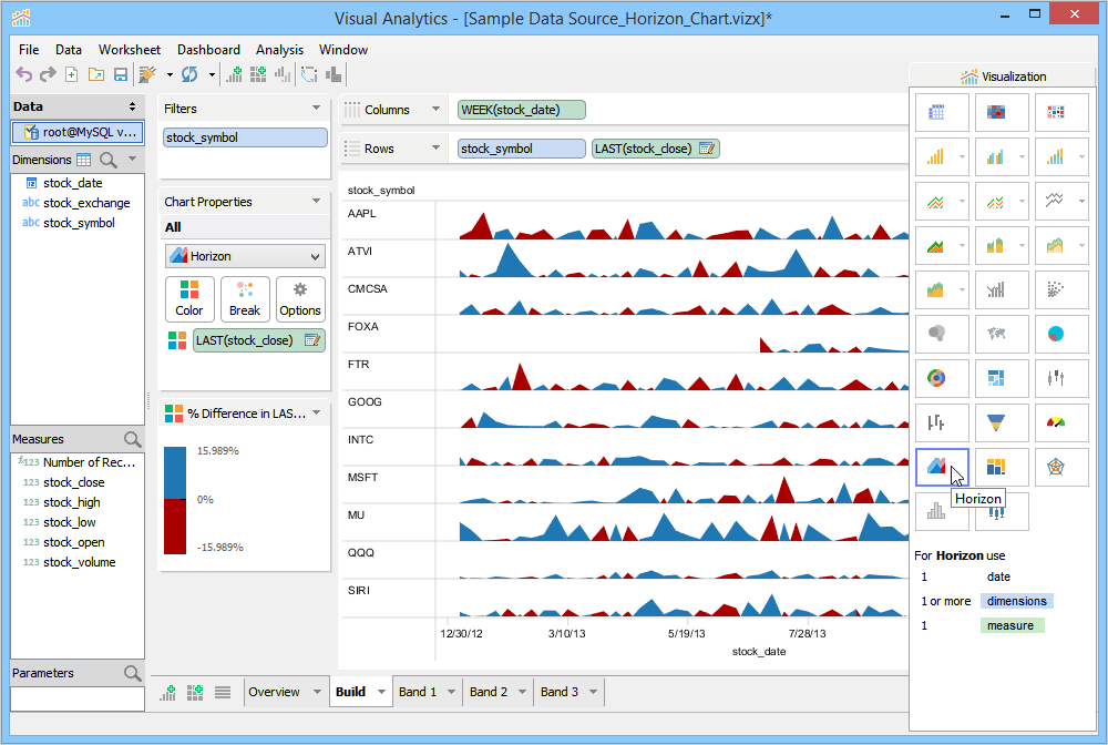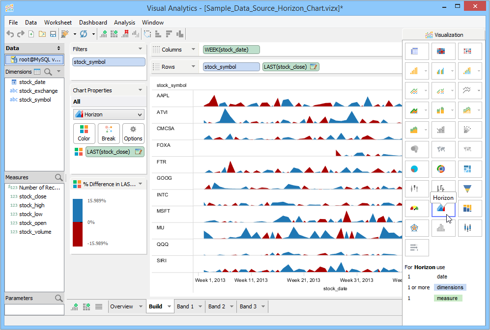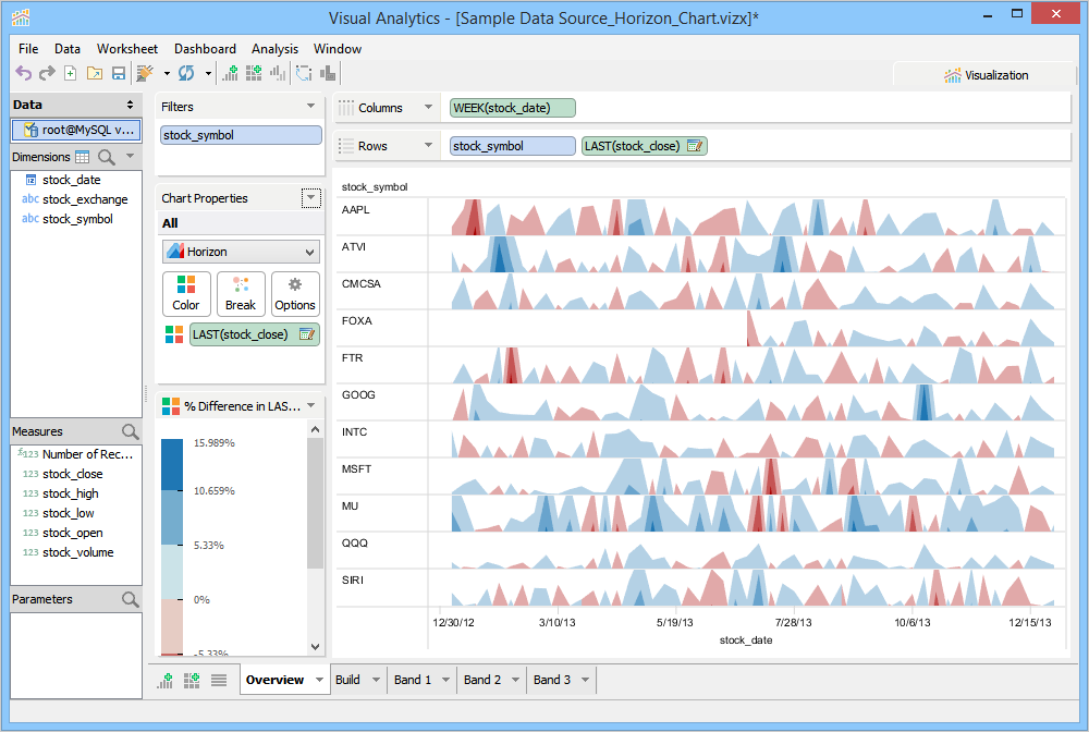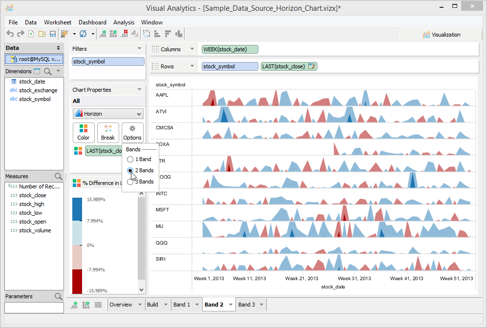 The number of bands controls the number of times the chart is divided and layered on top of each other. This has the desired effect of reducing the amount of vertical space required to draw the chart. For every layer or band that is added, a different color intensity is used to distinguish each band. You can easily spot stocks with extreme values as they appear in darker shades.